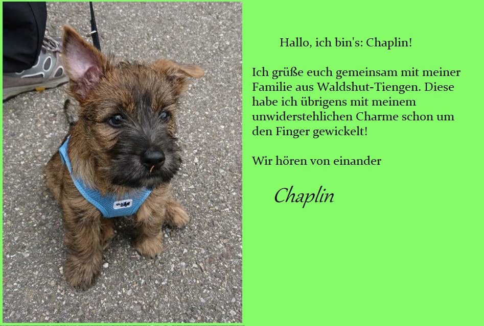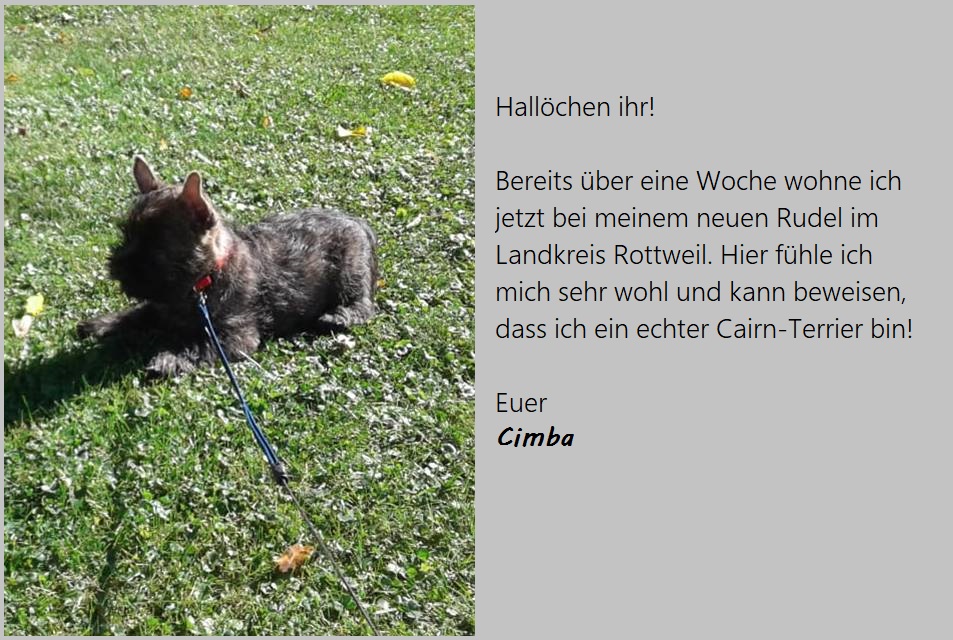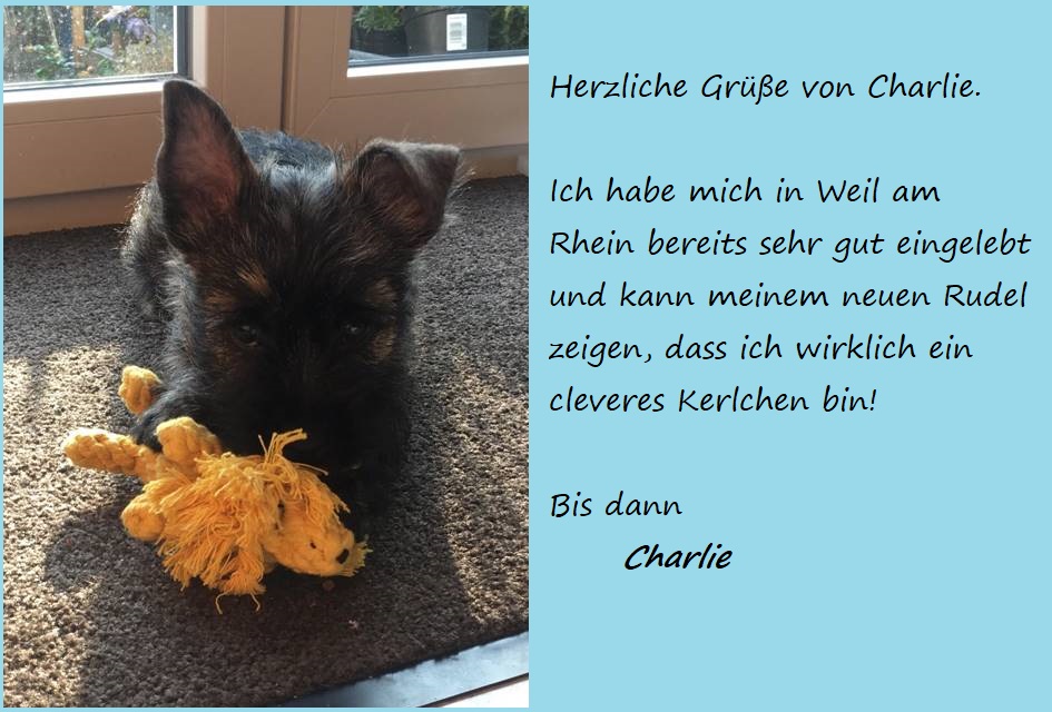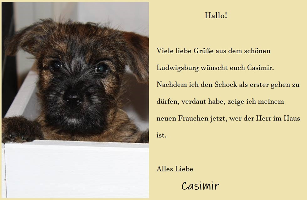 Inzwischen sind wir fünf alle in unser neues Zuhause gezogen: Die vier Herren (Casimir, Charlie, Chaplin und Cimba) am vorletzten und Cosima am letzten Wochenende. Hier fühlen wir uns sehr wohl und zeigen was wir können, unsere neuen Rudel müssen ja auch wissen wer der Chef ist, oder?!