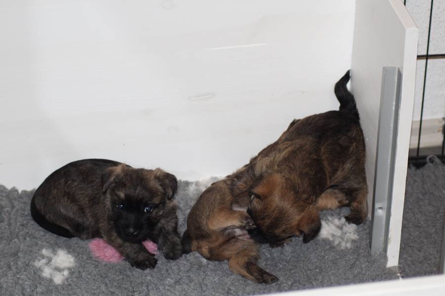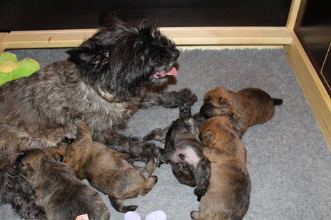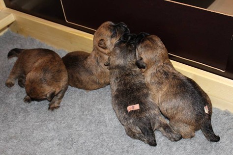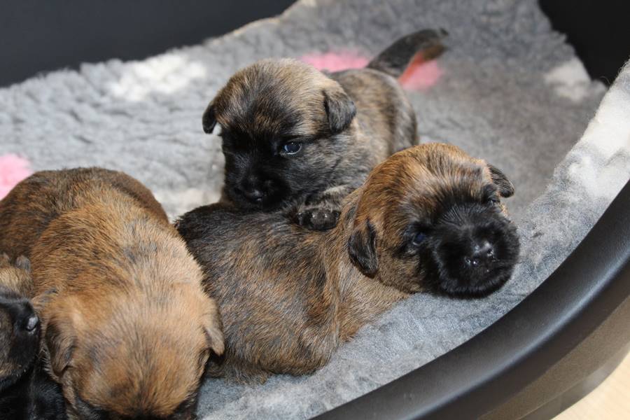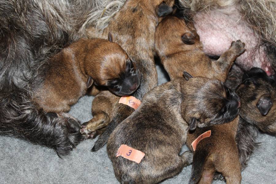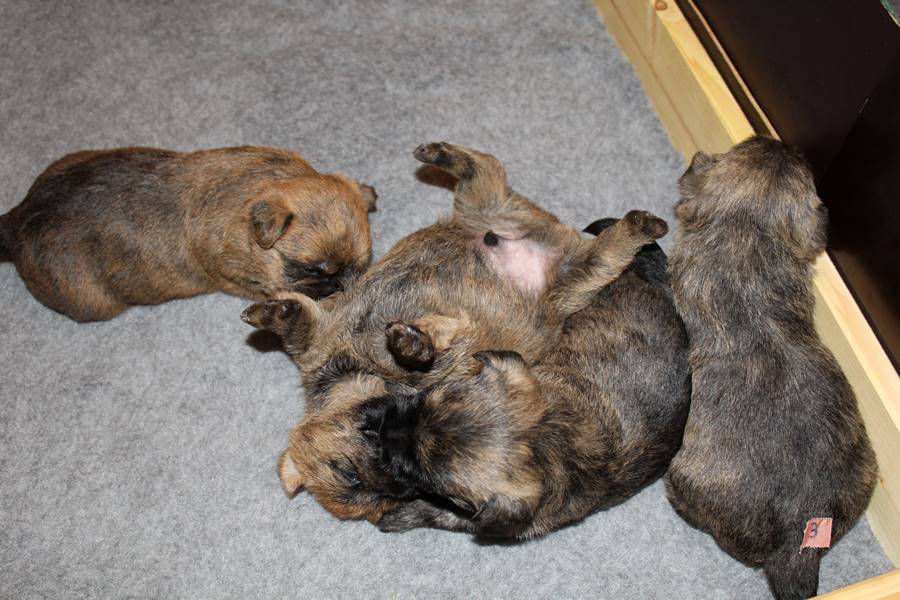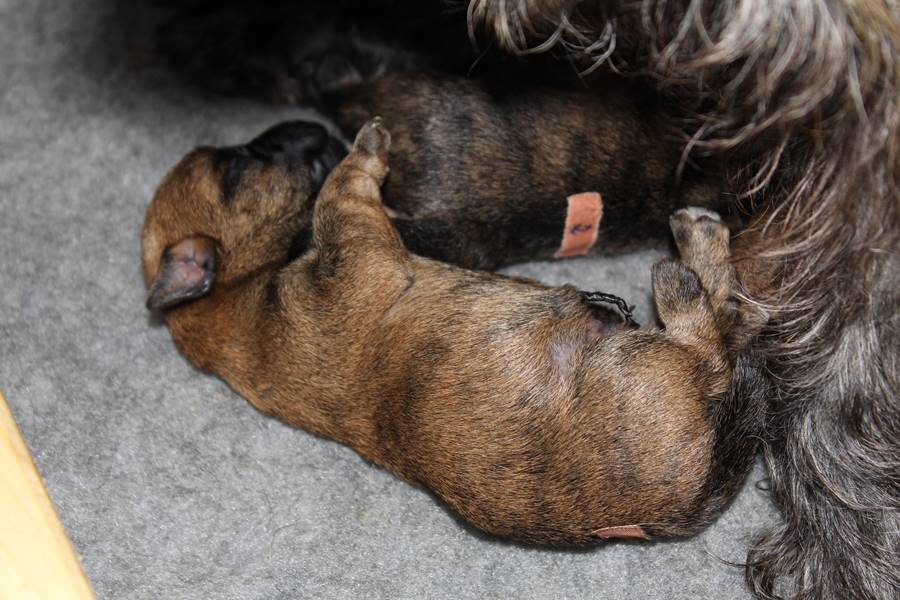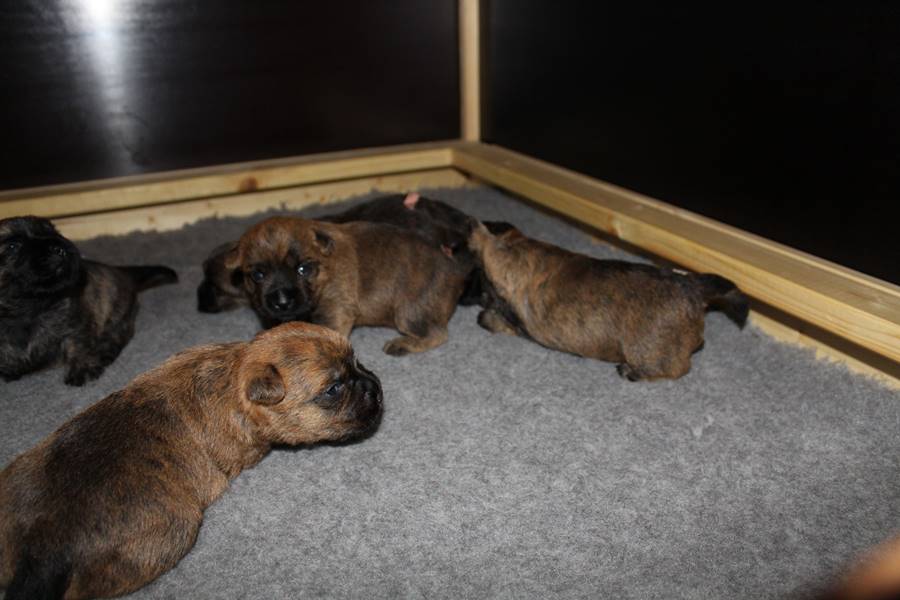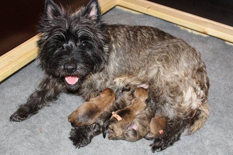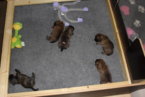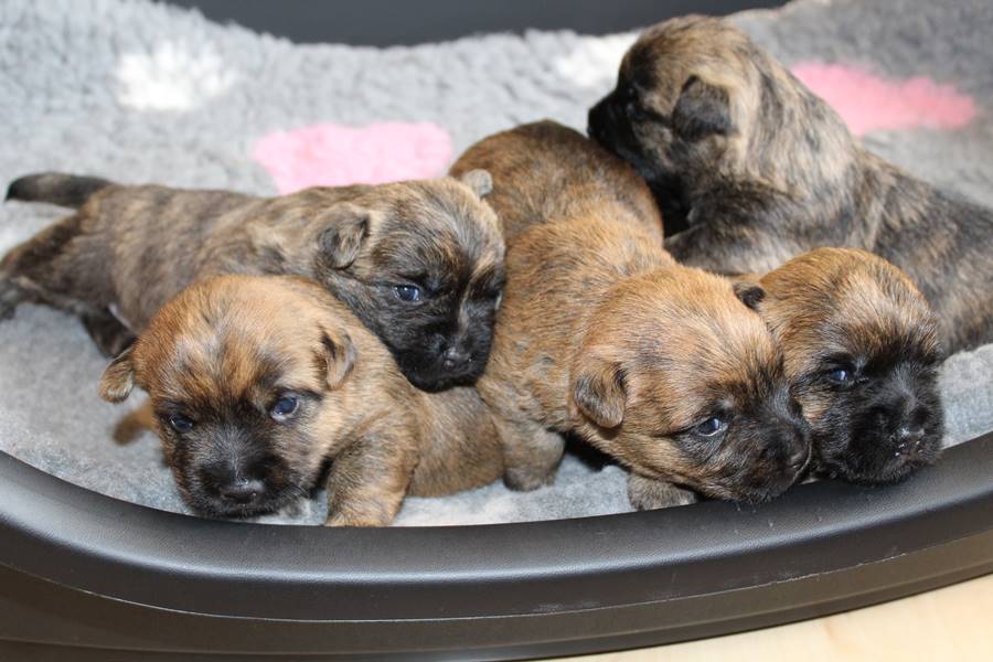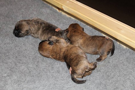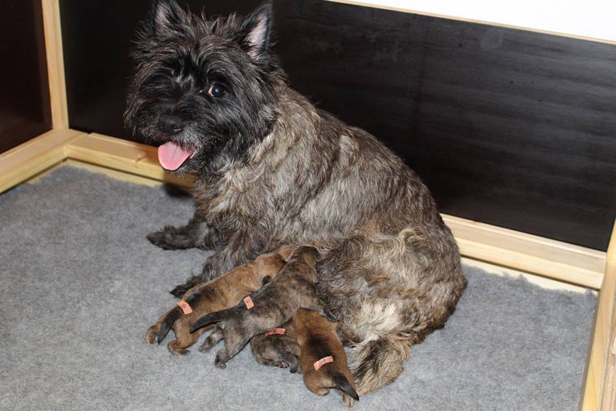 Nachdem wir am Donnerstag (26.07.18) begonnen hatten den Count-Down für die lang ersehnte Geburt unseres C-Wurfs, die für dem 28.07.18 - den 63. Tag nach dem Decken - angesetzt war, zu starten, belehrte uns unsere hochschwangere Gwenny eines Besseren. Am Abend des heißen Sommertages begann Gwenny zu hecheln. Wir schoben es zu erst auf die Hitze, schnell zeigte sich aber, dass Gwenny wohl auch aus einem anderen Grund hechelte. Sie zog sich in ihre Wurfkiste zurück und begann alles für die bevorstehende Geburt bereit zu machen. Im gemachten Nest tankte sie noch einmal Kraft für den großen Augenblick, der am nächsten Morgen (27.07.18) gekommen war. So platze um ungefähr 6:00 Uhr in der Frühe die erste Fruchtblase - der erste Welpe wurde um 6:19 Uhr geboren. In den nächsten 3 Stunden folgten vier weitere Welpen, sodass Gwenny (Great Gwenny Wizard of Wishes) und Mitch (Camster Cairns X-tra Hot`n Spicy) nun stolze Eltern von einem bezaubernden Mädchen und vier properen Jungs sind.