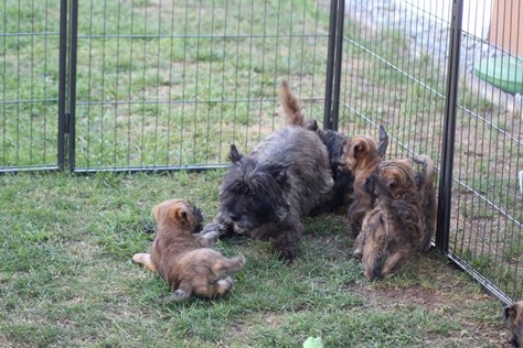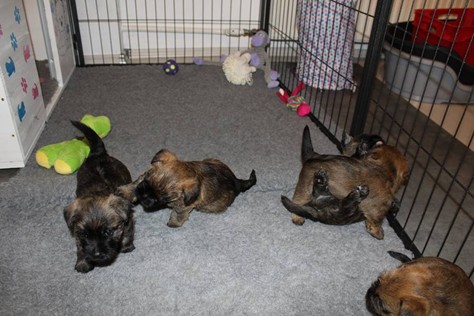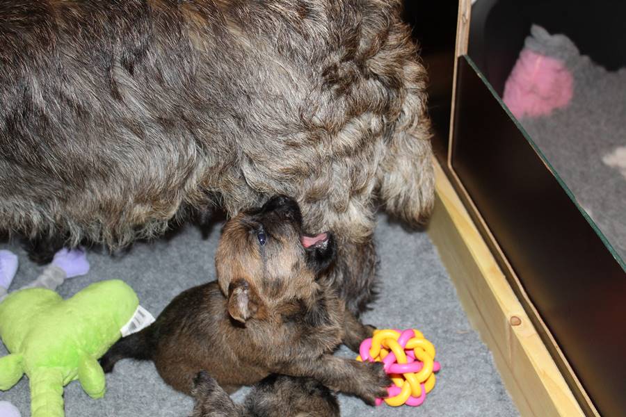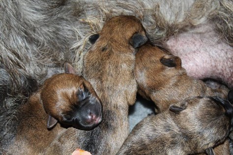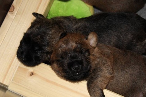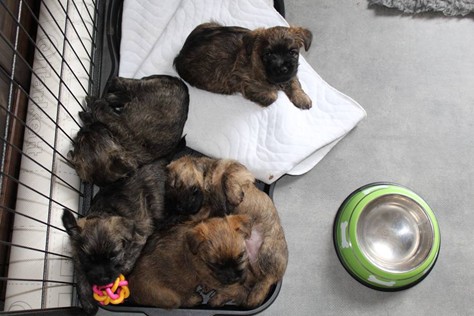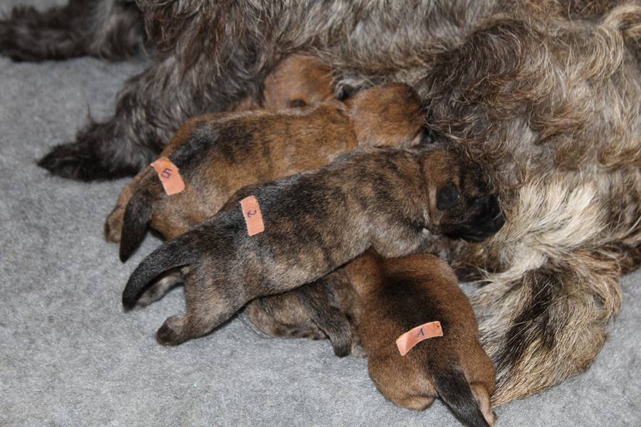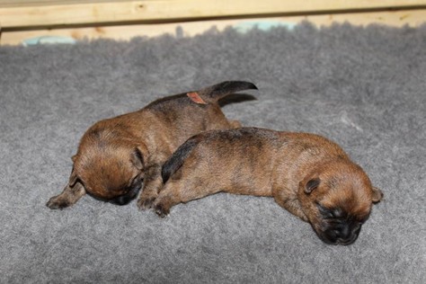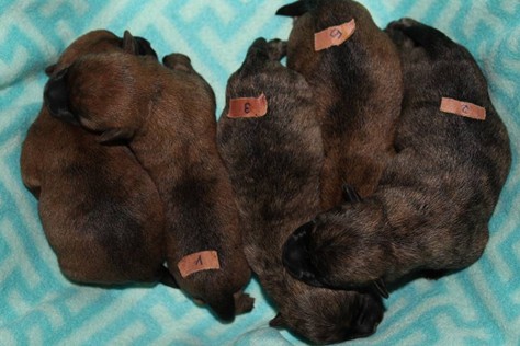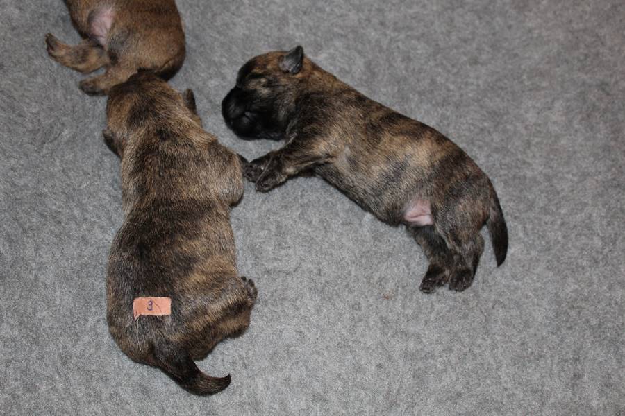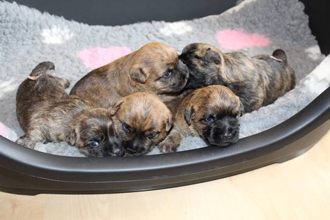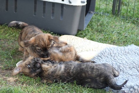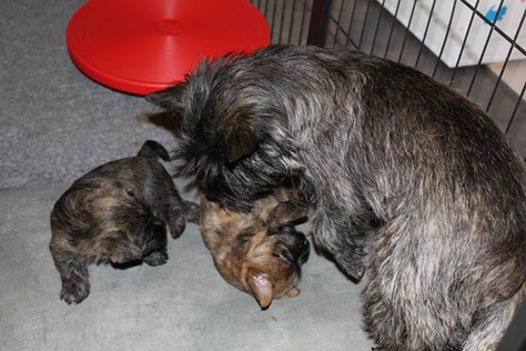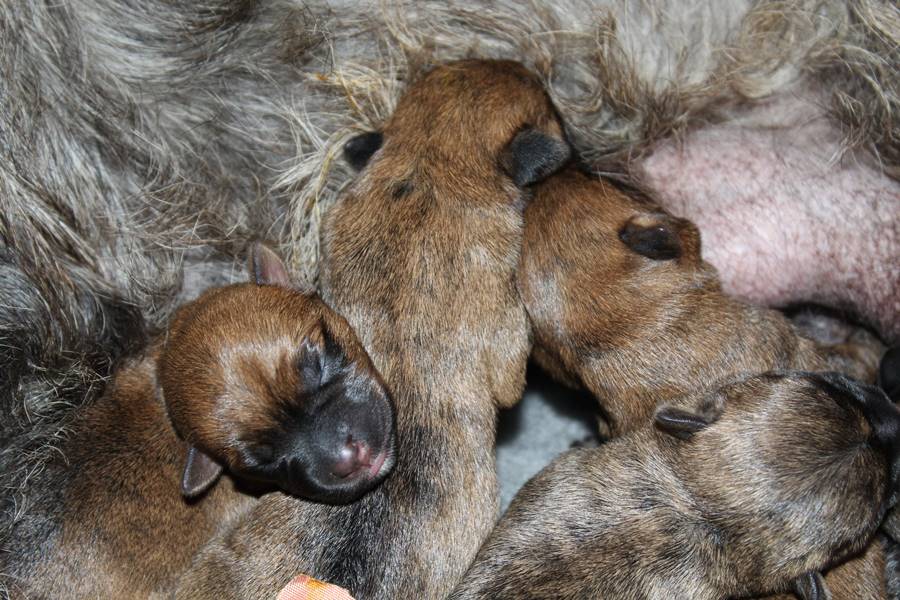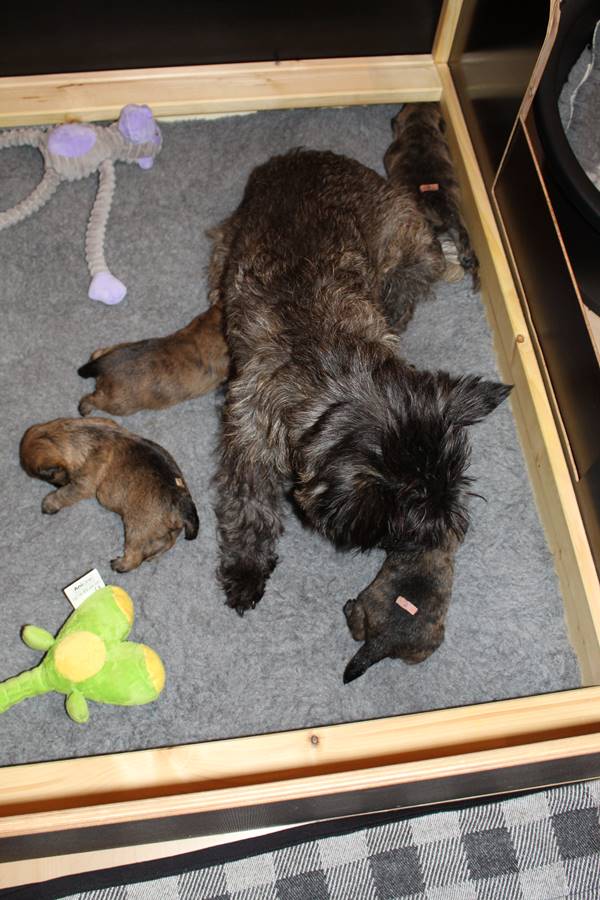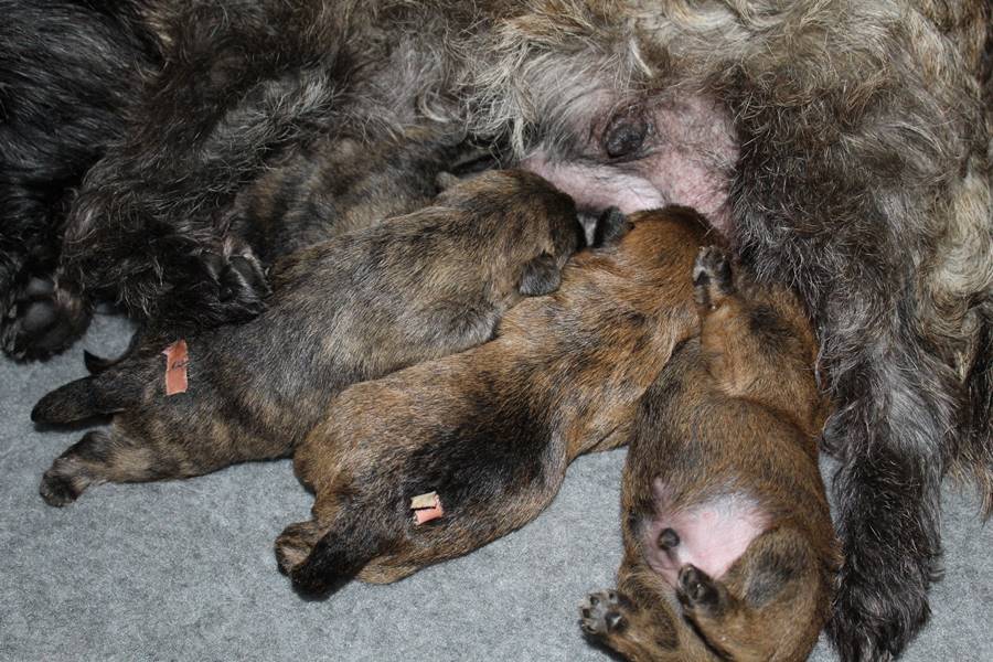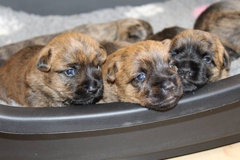 Nachdem wir am Donnerstag (26.07.18) begonnen hatten den Count-Down für die lang ersehnte Geburt unseres C-Wurfs, die für dem 28.07.18 - den 63. Tag nach dem Decken - angesetzt war, zu starten, belehrte uns unsere hochschwangere Gwenny eines Besseren. Am Abend des heißen Sommertages begann Gwenny zu hecheln. Wir schoben es zu erst auf die Hitze, schnell zeigte sich aber, dass Gwenny wohl auch aus einem anderen Grund hechelte. Sie zog sich in ihre Wurfkiste zurück und begann alles für die bevorstehende Geburt bereit zu machen. Im gemachten Nest tankte sie noch einmal Kraft für den großen Augenblick, der am nächsten Morgen (27.07.18) gekommen war. So platze um ungefähr 6:00 Uhr in der Frühe die erste Fruchtblase - der erste Welpe wurde um 6:19 Uhr geboren. In den nächsten 3 Stunden folgten vier weitere Welpen, sodass Gwenny (Great Gwenny Wizard of Wishes) und Mitch (Camster Cairns X-tra Hot`n Spicy) nun stolze Eltern von einem bezaubernden Mädchen und vier properen Jungs sind.