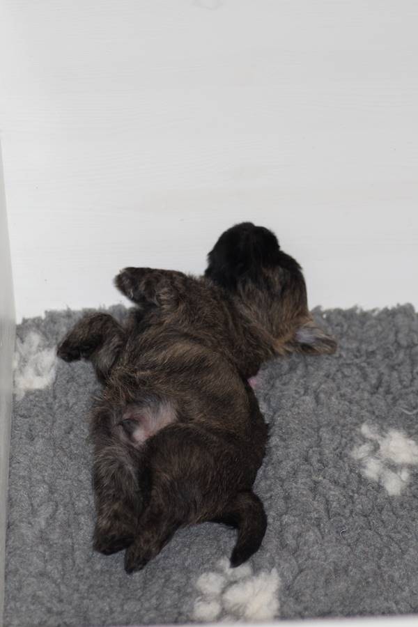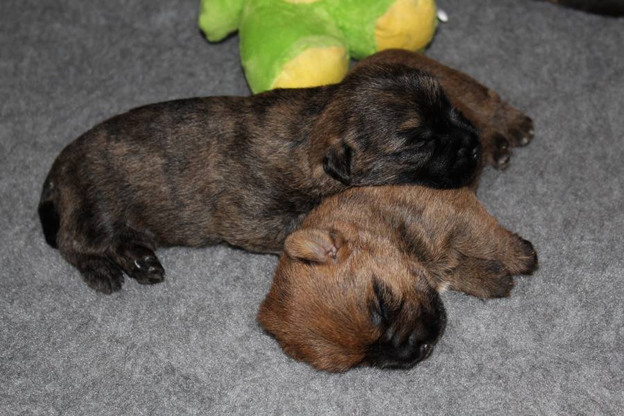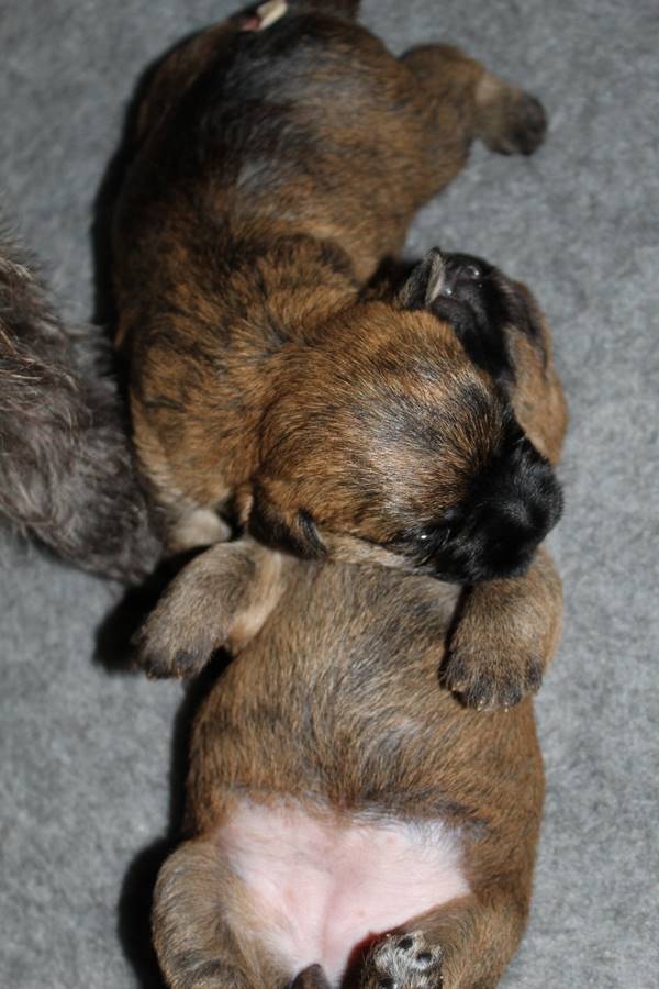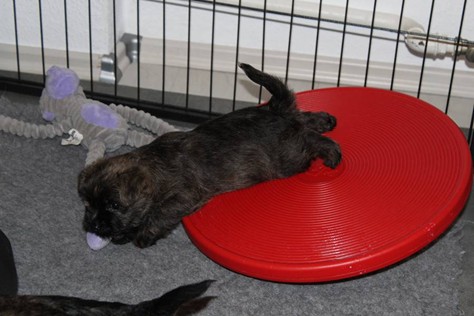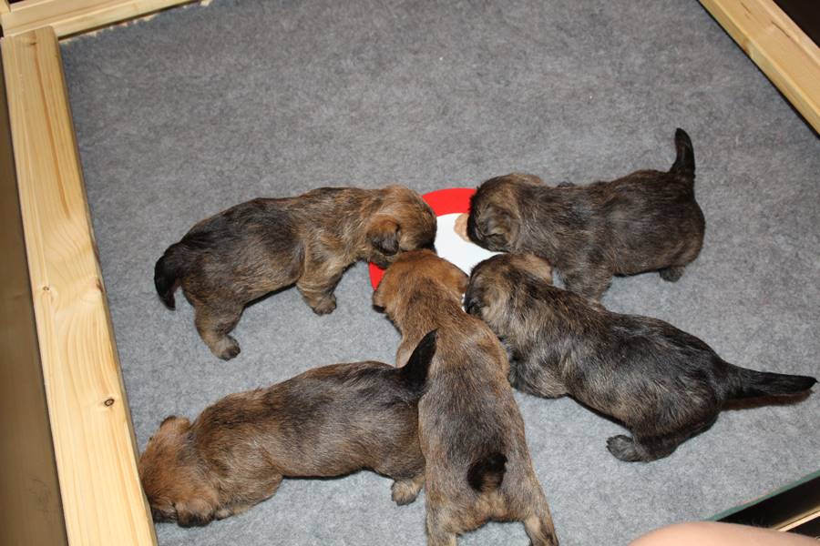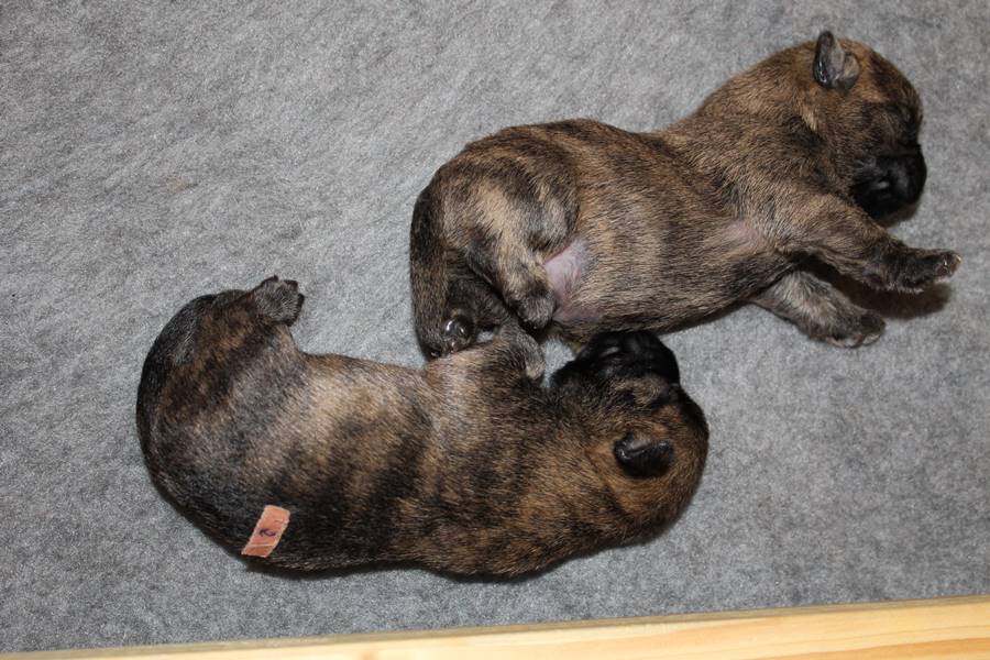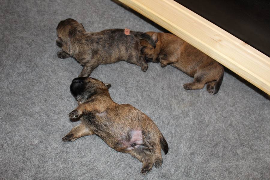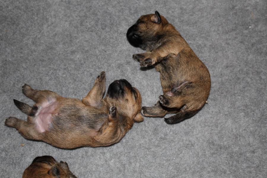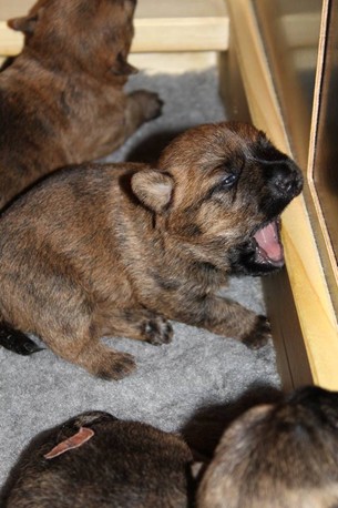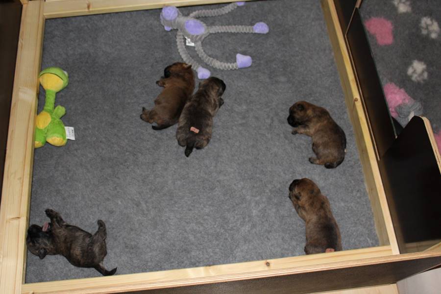 Schaue ich mich und meine Geschwister aber so an - Das können wir nun, weil alle samt diese Woche ihre Augen geöffnet haben! - Kann ich es kaum glauben... Nur eine Woche soll vergangen sein... Nein, dafür sind wir doch alle viel zu viel gewachsen... Das kann nicht sein! Aber, wir Fünf haben eine Erklärung gefunden: Wir sind in die Zukunft gereist und sind eigentlich schon älter! Die Menschen haben das aber nicht bemerkt. Sie meinen Welpen-Frühförderung mit uns machen zu müssen, obwohl wir dafür doch eigentlich schon viel zu groß sind. Da machen sie aber lauter lustige Sachen mit uns, zum Beispiel drehen sie uns kopfüber. Wir wissen nicht so genau was wir davon halten sollen... Dann war diese Woche am Freitag unsere Zuchtwartin noch bei uns zu Besuch, um nach uns zu sehen. Sie war sehr begeistert von uns Babys und unserer Mami und lobte uns sehr. Von ihr erfuhren wir dann auch, dass wir anscheinend doch nicht in die Zukunft gereist sind, sondern einfach nur viel Essen und deshalb schon so groß sind - darauf wären wir wohl nicht gekommen... Nachdem wir diese Tatsache verdaut hatten, haben uns die Zweibeiner dann noch unsere Krallen geschnitten. Eins könnt ihr mir glauben, wenn ihr die Wahl zwischen Welpen-Frühförderung und Krallenschneiden habt, entscheidet euch für die Frühförderung... Aber nun haben wir es überstanden, und können fleißig weiter üben zu laufen, darin sind wir nämlich schon echte Profis!