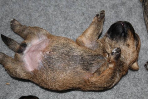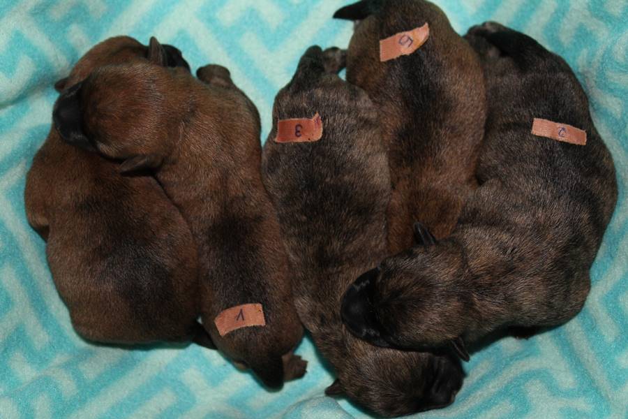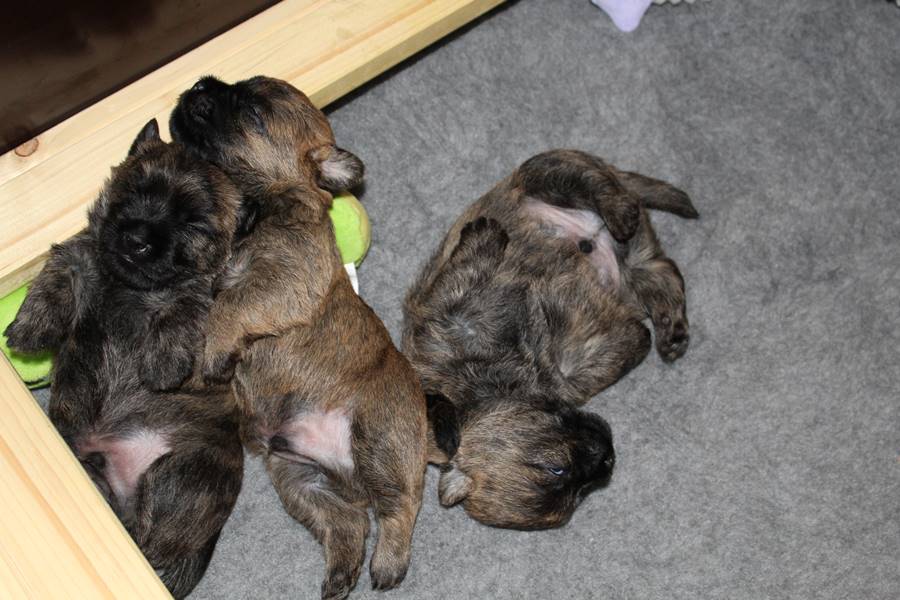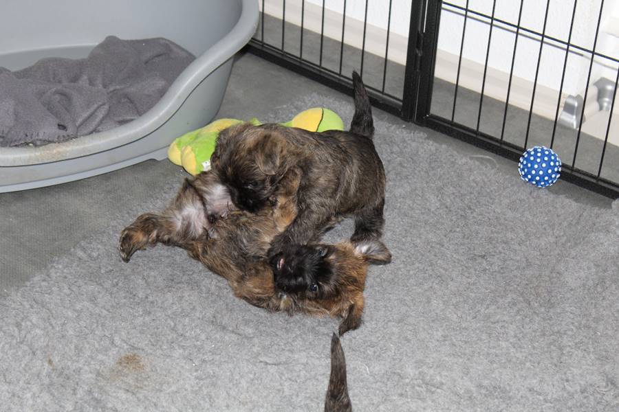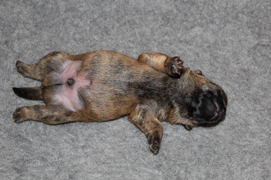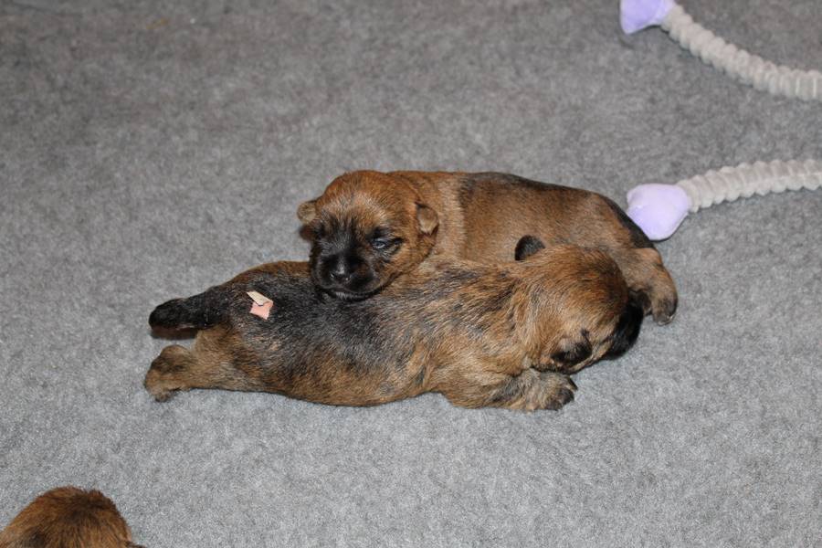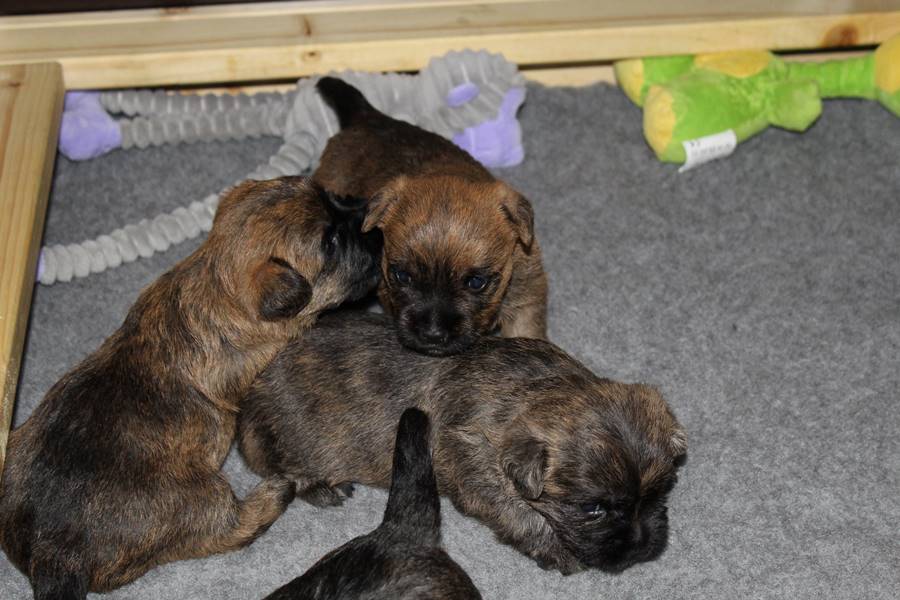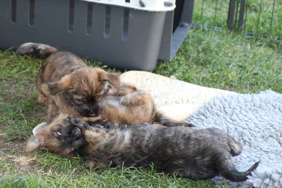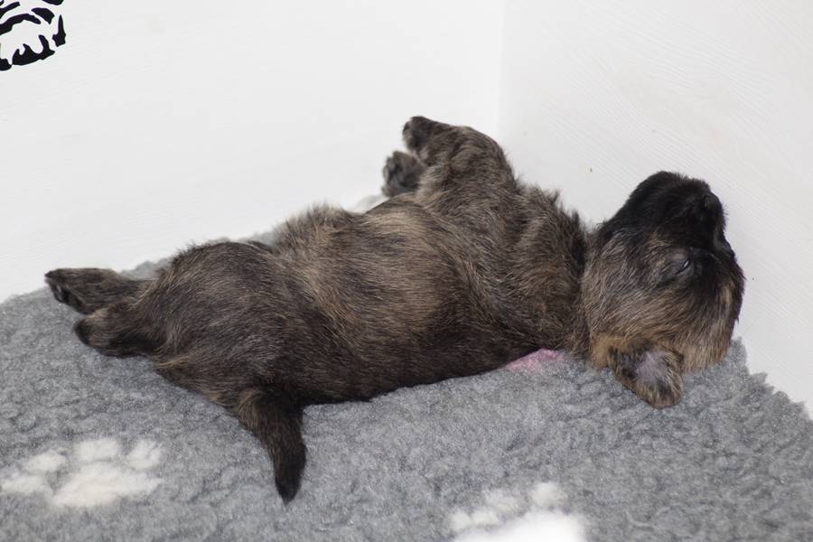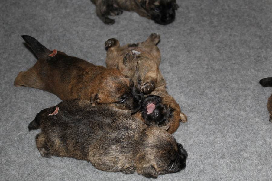 Schaue ich mich und meine Geschwister aber so an - Das können wir nun, weil alle samt diese Woche ihre Augen geöffnet haben! - Kann ich es kaum glauben... Nur eine Woche soll vergangen sein... Nein, dafür sind wir doch alle viel zu viel gewachsen... Das kann nicht sein! Aber, wir Fünf haben eine Erklärung gefunden: Wir sind in die Zukunft gereist und sind eigentlich schon älter! Die Menschen haben das aber nicht bemerkt. Sie meinen Welpen-Frühförderung mit uns machen zu müssen, obwohl wir dafür doch eigentlich schon viel zu groß sind. Da machen sie aber lauter lustige Sachen mit uns, zum Beispiel drehen sie uns kopfüber. Wir wissen nicht so genau was wir davon halten sollen... Dann war diese Woche am Freitag unsere Zuchtwartin noch bei uns zu Besuch, um nach uns zu sehen. Sie war sehr begeistert von uns Babys und unserer Mami und lobte uns sehr. Von ihr erfuhren wir dann auch, dass wir anscheinend doch nicht in die Zukunft gereist sind, sondern einfach nur viel Essen und deshalb schon so groß sind - darauf wären wir wohl nicht gekommen... Nachdem wir diese Tatsache verdaut hatten, haben uns die Zweibeiner dann noch unsere Krallen geschnitten. Eins könnt ihr mir glauben, wenn ihr die Wahl zwischen Welpen-Frühförderung und Krallenschneiden habt, entscheidet euch für die Frühförderung... Aber nun haben wir es überstanden, und können fleißig weiter üben zu laufen, darin sind wir nämlich schon echte Profis!
