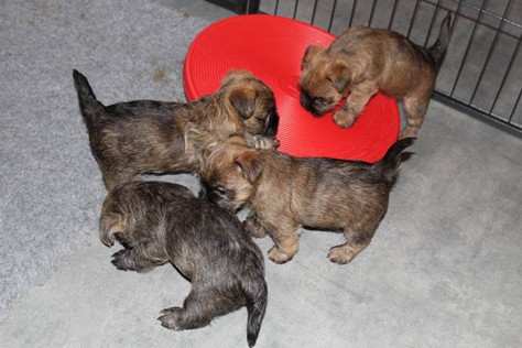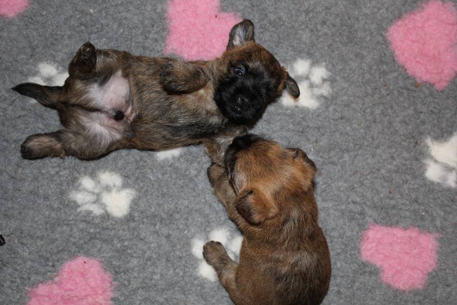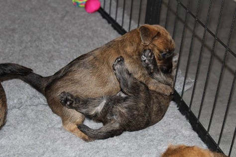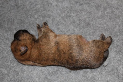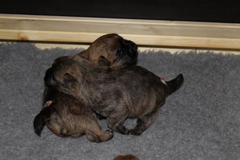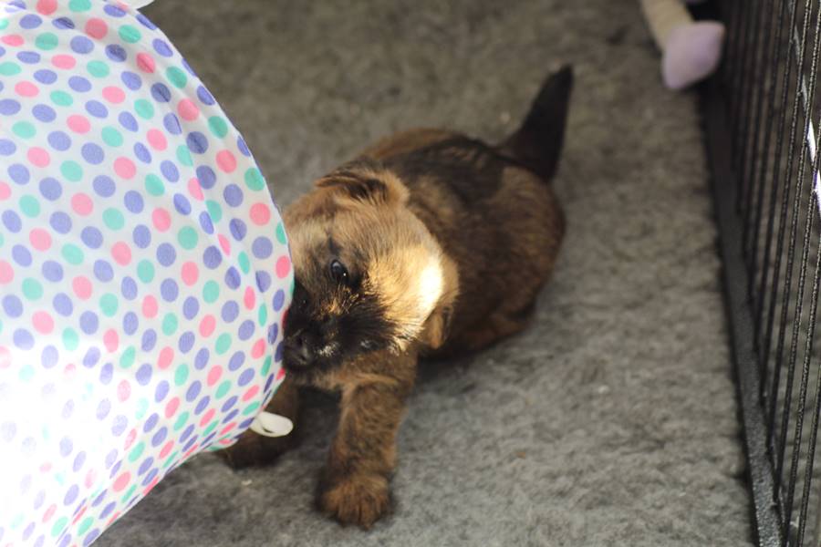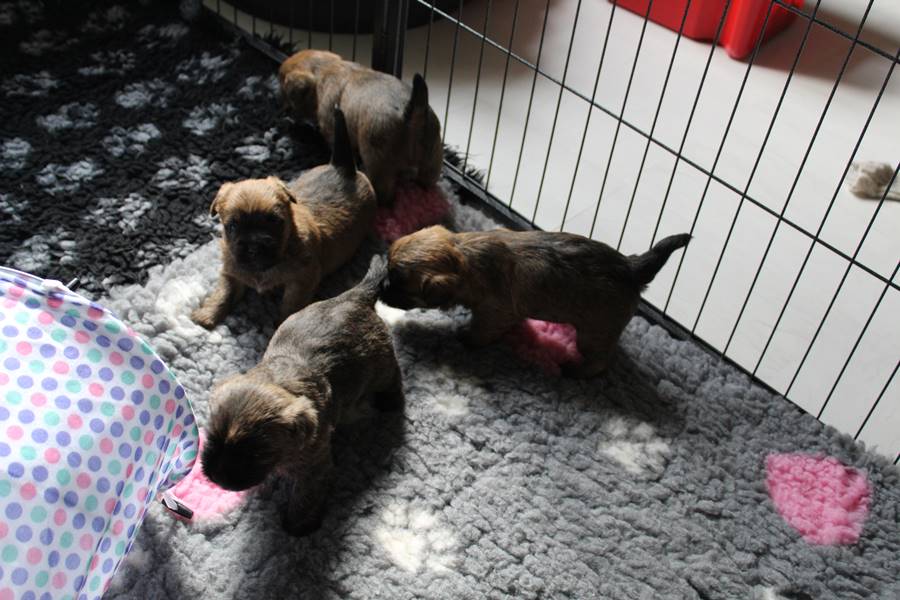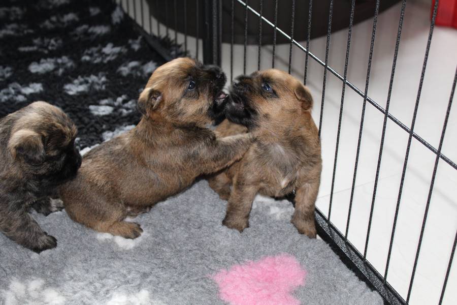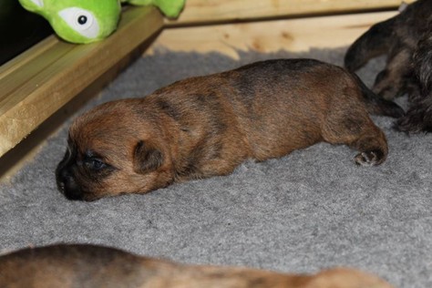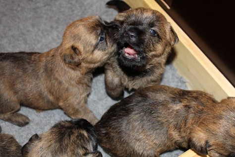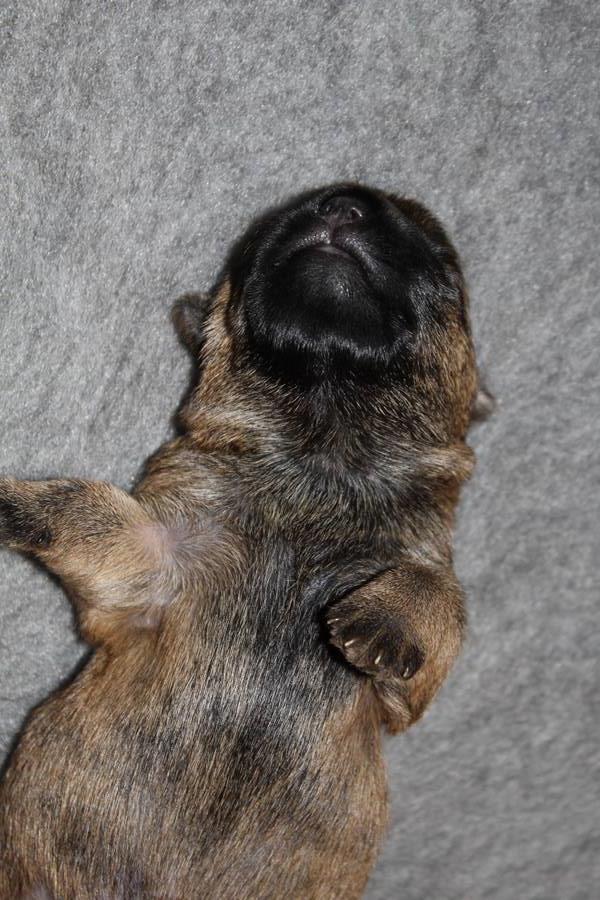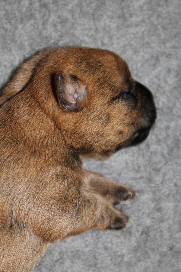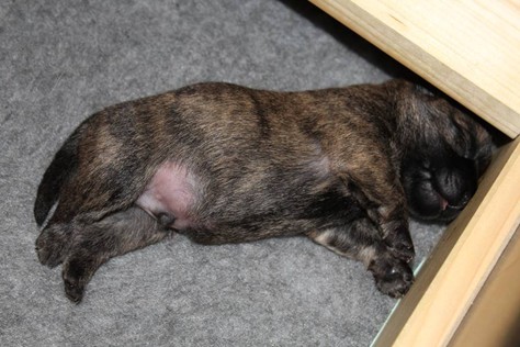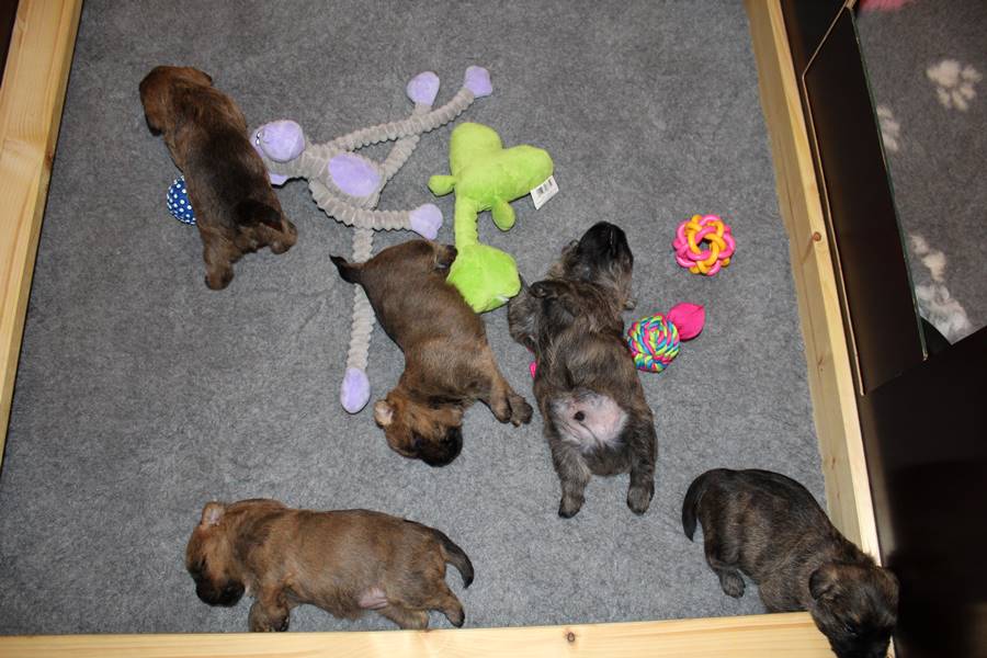 Schaue ich mich und meine Geschwister aber so an - Das können wir nun, weil alle samt diese Woche ihre Augen geöffnet haben! - Kann ich es kaum glauben... Nur eine Woche soll vergangen sein... Nein, dafür sind wir doch alle viel zu viel gewachsen... Das kann nicht sein! Aber, wir Fünf haben eine Erklärung gefunden: Wir sind in die Zukunft gereist und sind eigentlich schon älter! Die Menschen haben das aber nicht bemerkt. Sie meinen Welpen-Frühförderung mit uns machen zu müssen, obwohl wir dafür doch eigentlich schon viel zu groß sind. Da machen sie aber lauter lustige Sachen mit uns, zum Beispiel drehen sie uns kopfüber. Wir wissen nicht so genau was wir davon halten sollen... Dann war diese Woche am Freitag unsere Zuchtwartin noch bei uns zu Besuch, um nach uns zu sehen. Sie war sehr begeistert von uns Babys und unserer Mami und lobte uns sehr. Von ihr erfuhren wir dann auch, dass wir anscheinend doch nicht in die Zukunft gereist sind, sondern einfach nur viel Essen und deshalb schon so groß sind - darauf wären wir wohl nicht gekommen... Nachdem wir diese Tatsache verdaut hatten, haben uns die Zweibeiner dann noch unsere Krallen geschnitten. Eins könnt ihr mir glauben, wenn ihr die Wahl zwischen Welpen-Frühförderung und Krallenschneiden habt, entscheidet euch für die Frühförderung... Aber nun haben wir es überstanden, und können fleißig weiter üben zu laufen, darin sind wir nämlich schon echte Profis!