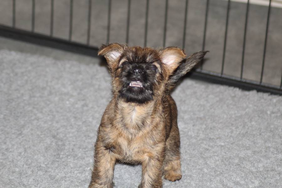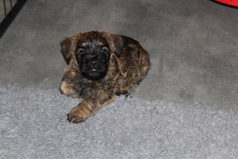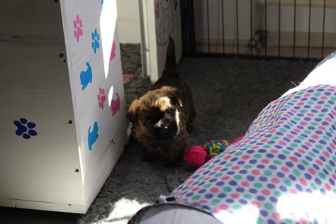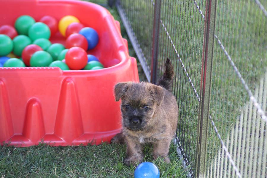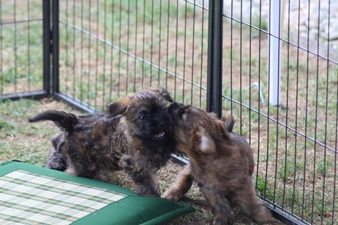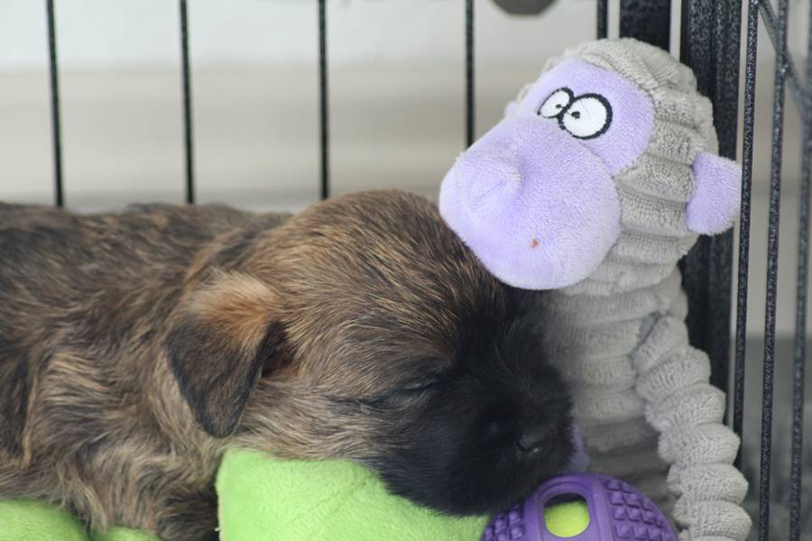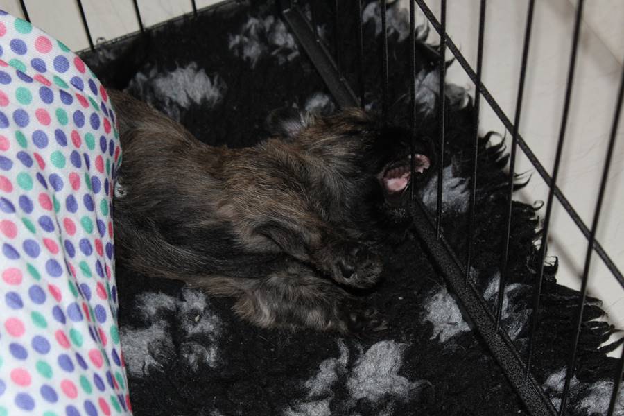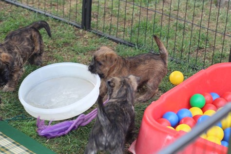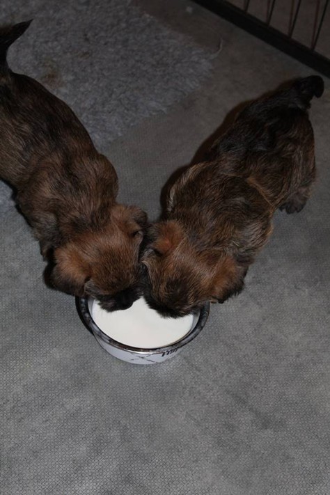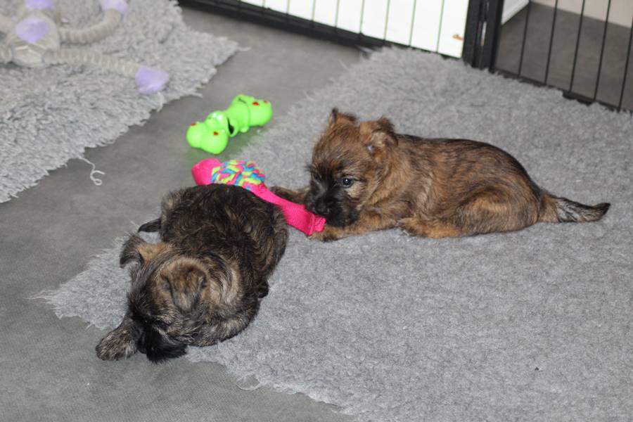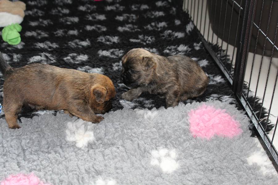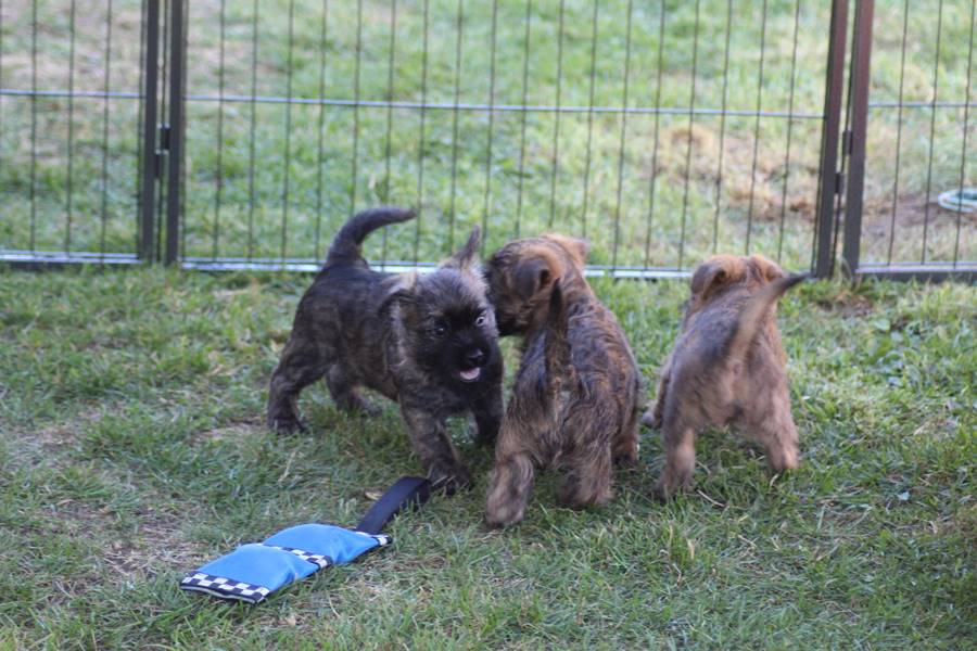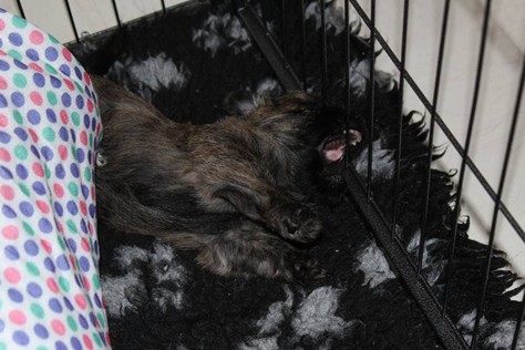 Schaue ich mich und meine Geschwister aber so an - Das können wir nun, weil alle samt diese Woche ihre Augen geöffnet haben! - Kann ich es kaum glauben... Nur eine Woche soll vergangen sein... Nein, dafür sind wir doch alle viel zu viel gewachsen... Das kann nicht sein! Aber, wir Fünf haben eine Erklärung gefunden: Wir sind in die Zukunft gereist und sind eigentlich schon älter! Die Menschen haben das aber nicht bemerkt. Sie meinen Welpen-Frühförderung mit uns machen zu müssen, obwohl wir dafür doch eigentlich schon viel zu groß sind. Da machen sie aber lauter lustige Sachen mit uns, zum Beispiel drehen sie uns kopfüber. Wir wissen nicht so genau was wir davon halten sollen... Dann war diese Woche am Freitag unsere Zuchtwartin noch bei uns zu Besuch, um nach uns zu sehen. Sie war sehr begeistert von uns Babys und unserer Mami und lobte uns sehr. Von ihr erfuhren wir dann auch, dass wir anscheinend doch nicht in die Zukunft gereist sind, sondern einfach nur viel Essen und deshalb schon so groß sind - darauf wären wir wohl nicht gekommen... Nachdem wir diese Tatsache verdaut hatten, haben uns die Zweibeiner dann noch unsere Krallen geschnitten. Eins könnt ihr mir glauben, wenn ihr die Wahl zwischen Welpen-Frühförderung und Krallenschneiden habt, entscheidet euch für die Frühförderung... Aber nun haben wir es überstanden, und können fleißig weiter üben zu laufen, darin sind wir nämlich schon echte Profis!