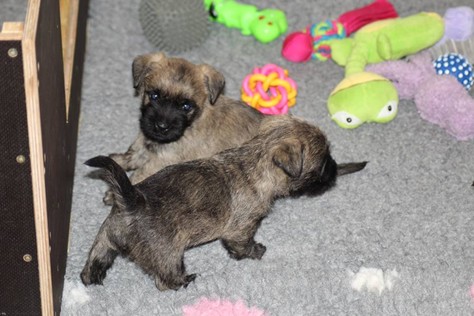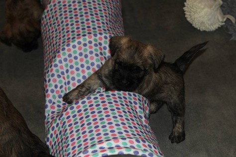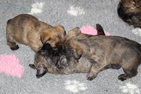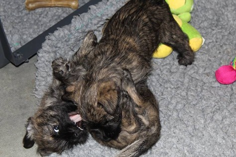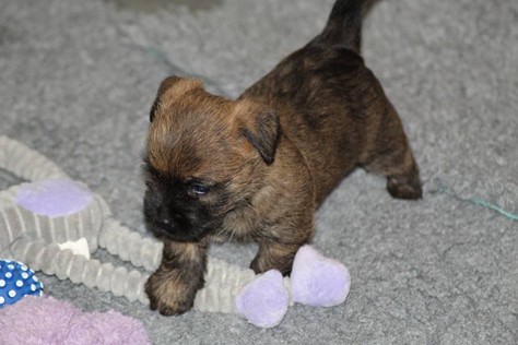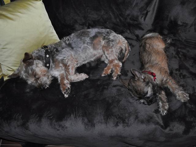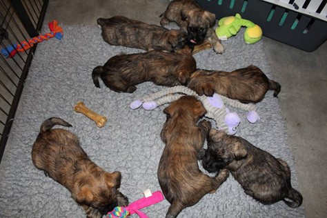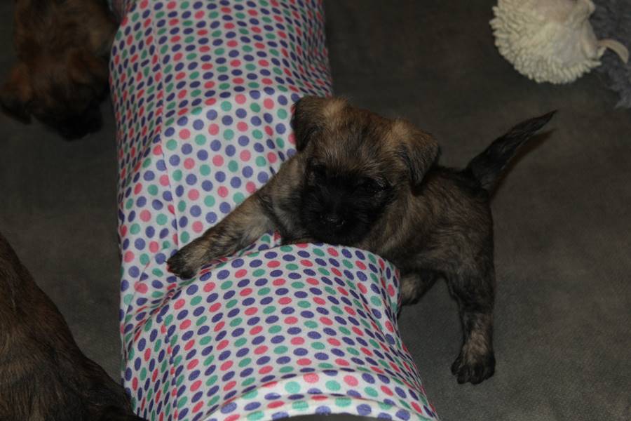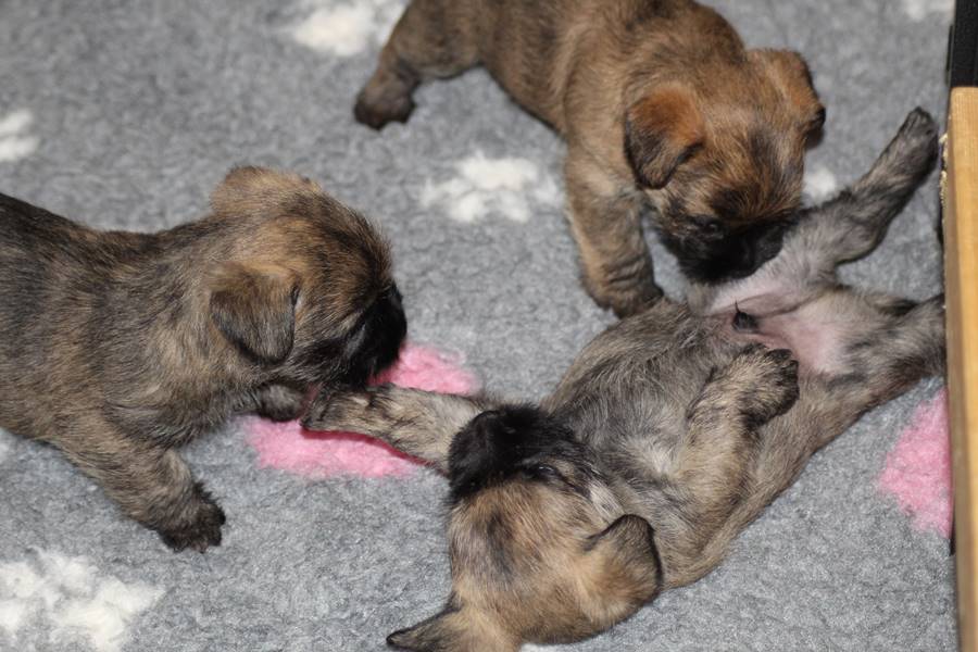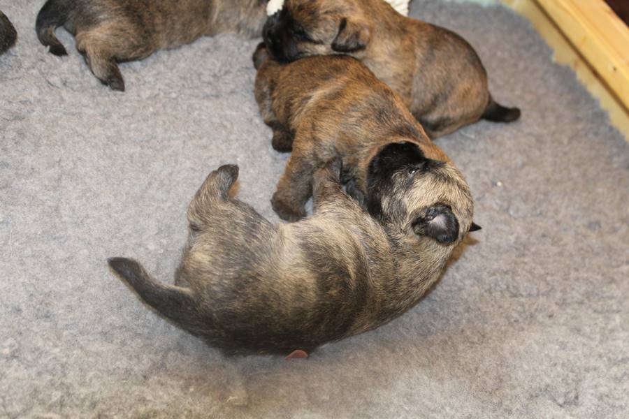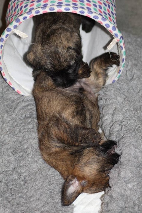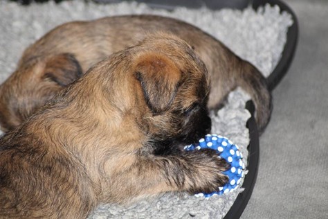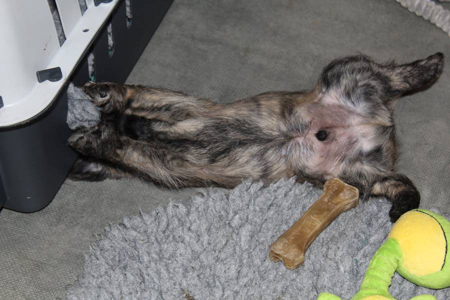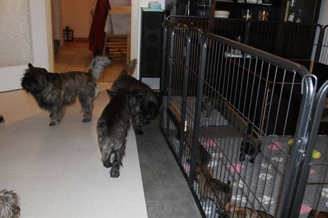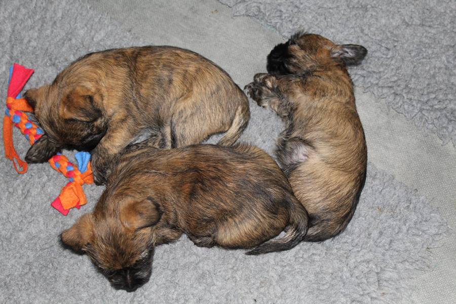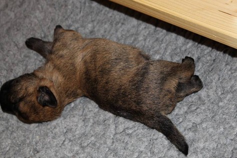 … Schon fast sechs Wochen waren nun vergangen, seit die sieben Zwerge mit ihrer Königin Emma in das wunderschöne Schloss gezogen waren und so hatten sich aus den damals klitzekleinen Winzlingen in dieser Zeit sieben unbändige Zwerge entwickelt. Alle hatten inzwischen spitze Zähnchen in ihrem Mund, die zwar zum Verspeisen des köstlichen BARFs vorteilhaft waren, beim überschwänglichen Spielen jedoch ziemlich piksten. Da kam es vor, dass man die Zwerge noch in den Gemächern des Fußvolkes schreien hörte, eilte dieses jedoch zu Hilfe, hatten die sieben Zwerge schon wieder vergessen weshalb sie geschrien hatten. Auch Königin Emma merkte die Zähnchen der Zwerge deutlich, wenn sie von ihrer Milch speisten, dies brachte sie aber nicht davon ab ihre Kleinen weiterhin zu füttern. Prinzessin Gwenny, Prinzessin Mira, Fee Lulu und Unhold Bob Marley unterhielten die sieben Zwerge sehr gerne und so vergingen die Tage für die sieben Zwerge wie im Flug. Besonders freuten sie sich jedoch über Besuch von Zweibeinern aus ferneren Königreichern, die mit den sieben Zwergen spielten und kuschelten. So waren die sieben Zwerge jeden Abend vom ganzen Spielen und Kuscheln so erschöpft, dass sie wie Steine in ihren Bettchen schliefen...