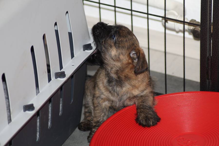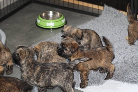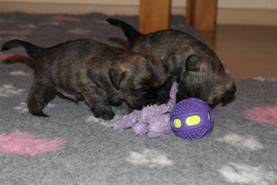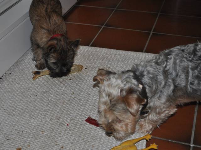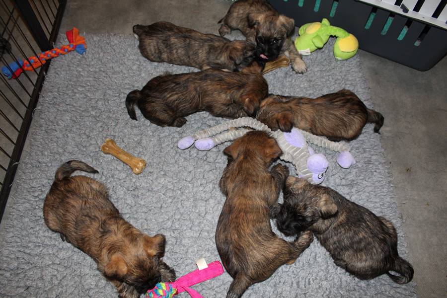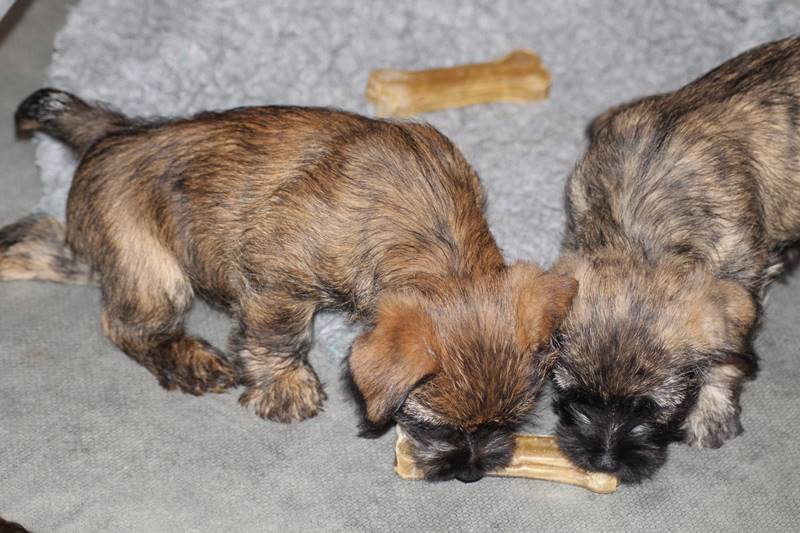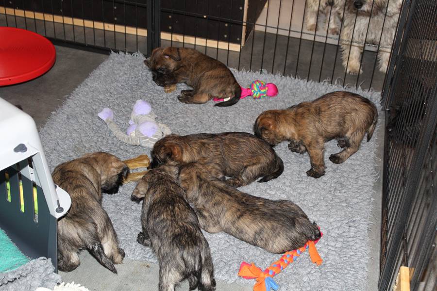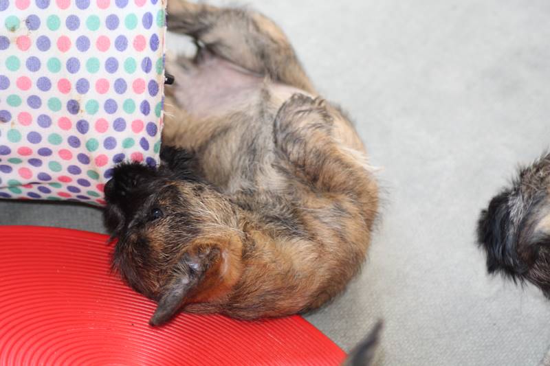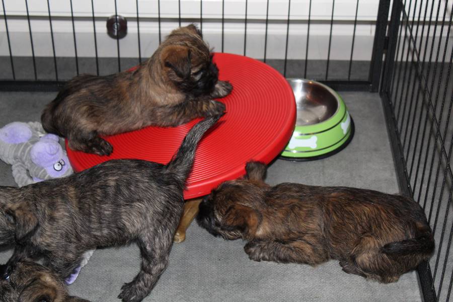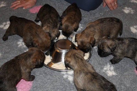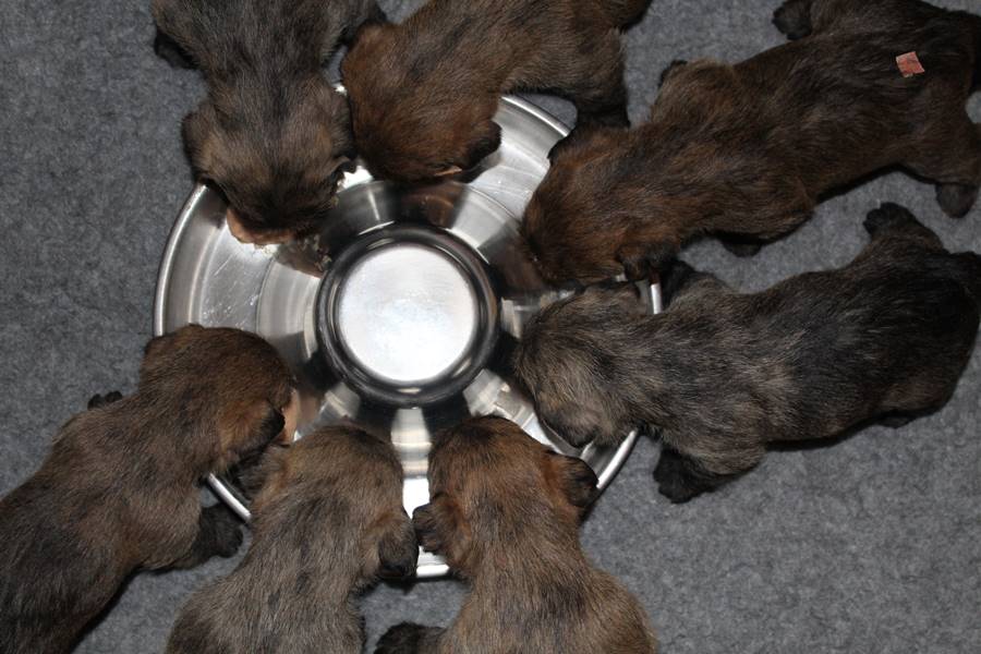 … Inzwischen lebten die sieben Zwerge und ihre Königin beinahe vier Wochen in ihrem wunderschönen Schloss und waren nicht nur sehr groß, sondern auch sehr lebendig geworden. Waren die Kleinen nun nicht damit beschäftigt zu schlafen, so konnte ein reges Treiben in den Mauern des Schlosses wahrgenommen werden: Es wurde nicht nur kräftig gerauft, die sieben Zwerge spielten außerdem sehr gerne mit der goldenen Kugel des Froschkönigs (Ball) oder ließen sich auf das Fußvolk herab, das sich sehr darüber freute, mit den Zwergen zu Spielen und zu Kuscheln. Als Königin Emma jedoch bemerkte, dass das Schloss so allmählich zu klein für die Raufereien ihrer Sprösslinge wurde, beauftragte sie das Fußvolk damit, den Burghof (Welpenauslauf im Wohnzimmer) für Ihre Kinder herzurichten, und so kam es, dass die Zwerge nun neben ihrem Schloss den Burghof zum Herumtollen hatten. Alle amüsierten sich hier prächtig und wenn sie wieder zurück ins gemütliche Schloss kehrten, brachten sie einen Bärenhunger mit. Königin Emma sorgte dann dafür, dass alle Sieben durch das Speisen ihrer köstlichen Milch gesättigt wurden, jedoch reichte diese für den Bärenhunger der Zwerge lange nicht aus. Und so war es die Aufgabe des Fußvolkes für die weitere Verköstigung der sieben Zwerge zu sorgen, indem sie ihnen auf einem silbernen Tablett (Napf) eine köstliche Mahlzeit (Beikost) servierten...