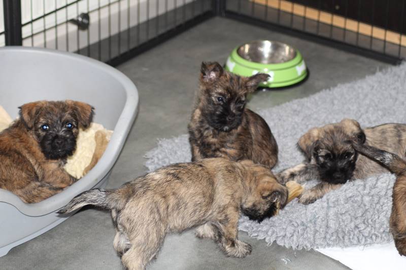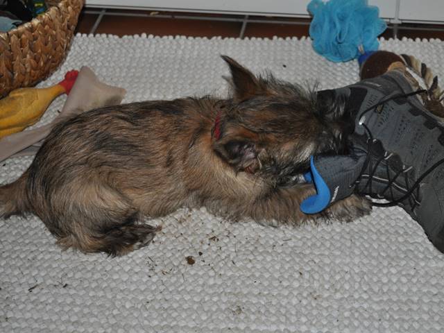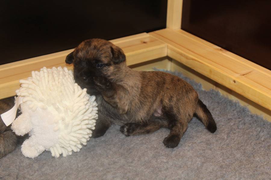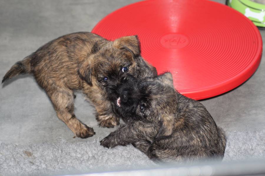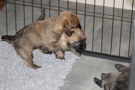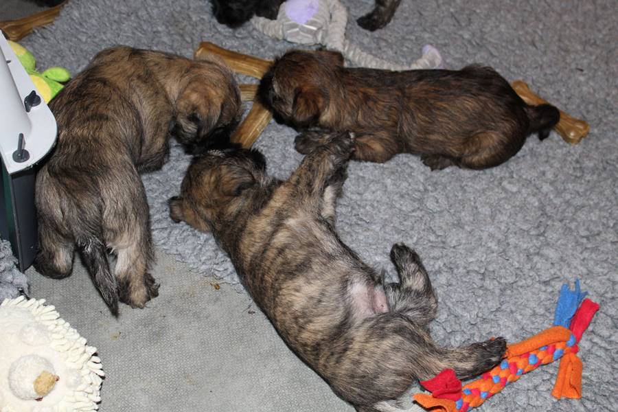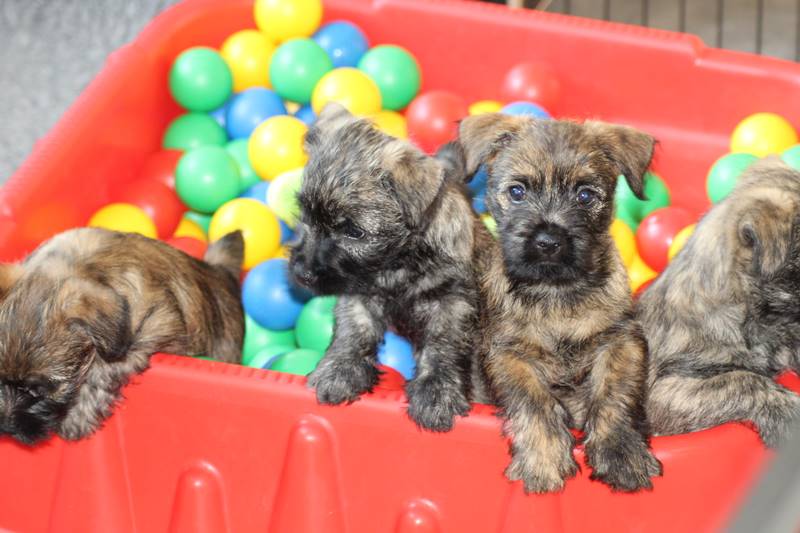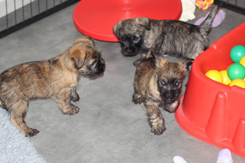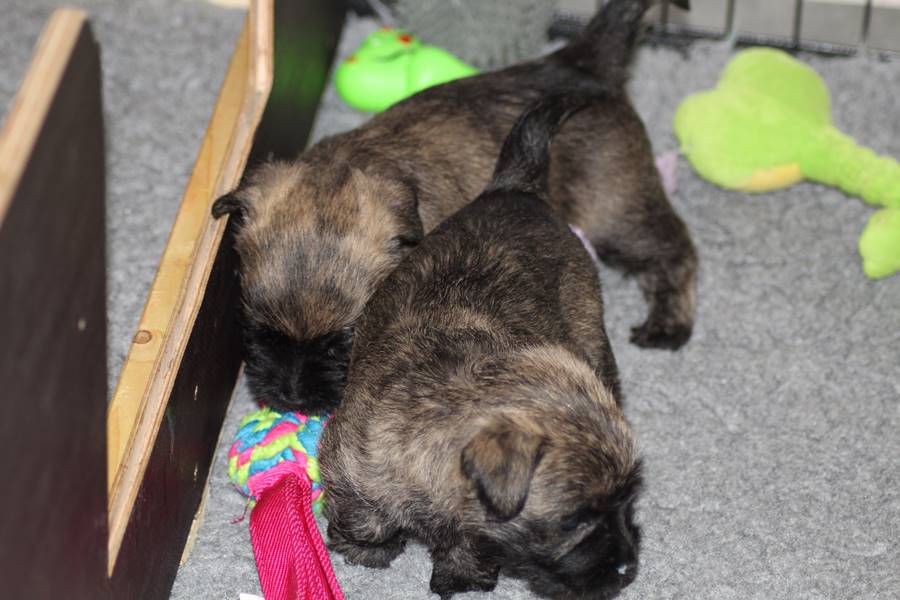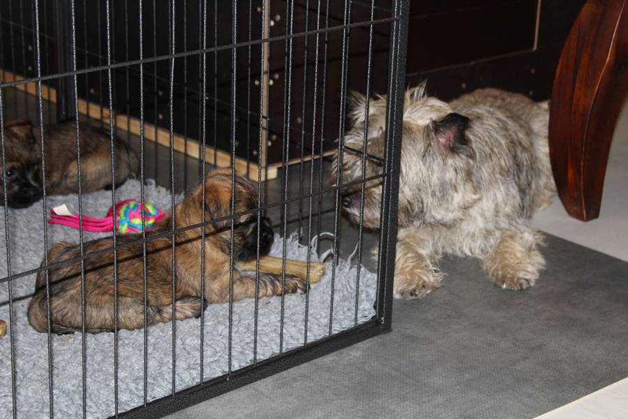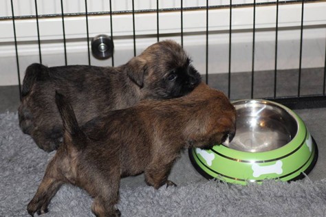 … Inzwischen lebten die sieben Zwerge und ihre Königin beinahe vier Wochen in ihrem wunderschönen Schloss und waren nicht nur sehr groß, sondern auch sehr lebendig geworden. Waren die Kleinen nun nicht damit beschäftigt zu schlafen, so konnte ein reges Treiben in den Mauern des Schlosses wahrgenommen werden: Es wurde nicht nur kräftig gerauft, die sieben Zwerge spielten außerdem sehr gerne mit der goldenen Kugel des Froschkönigs (Ball) oder ließen sich auf das Fußvolk herab, das sich sehr darüber freute, mit den Zwergen zu Spielen und zu Kuscheln. Als Königin Emma jedoch bemerkte, dass das Schloss so allmählich zu klein für die Raufereien ihrer Sprösslinge wurde, beauftragte sie das Fußvolk damit, den Burghof (Welpenauslauf im Wohnzimmer) für Ihre Kinder herzurichten, und so kam es, dass die Zwerge nun neben ihrem Schloss den Burghof zum Herumtollen hatten. Alle amüsierten sich hier prächtig und wenn sie wieder zurück ins gemütliche Schloss kehrten, brachten sie einen Bärenhunger mit. Königin Emma sorgte dann dafür, dass alle Sieben durch das Speisen ihrer köstlichen Milch gesättigt wurden, jedoch reichte diese für den Bärenhunger der Zwerge lange nicht aus. Und so war es die Aufgabe des Fußvolkes für die weitere Verköstigung der sieben Zwerge zu sorgen, indem sie ihnen auf einem silbernen Tablett (Napf) eine köstliche Mahlzeit (Beikost) servierten...
