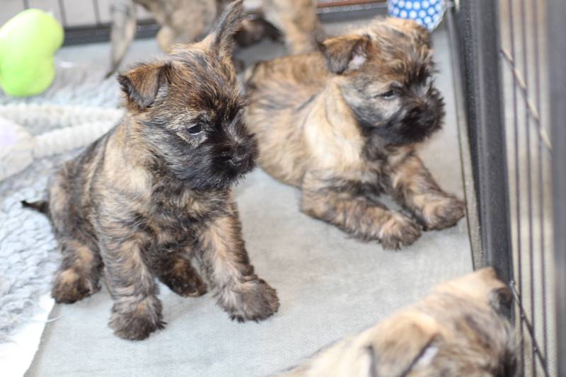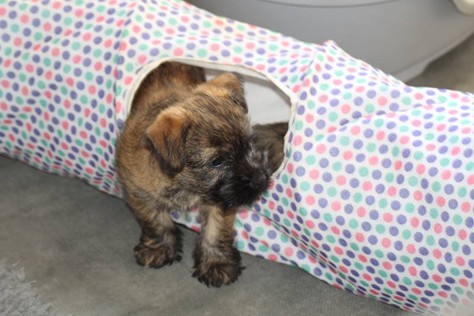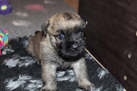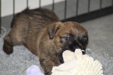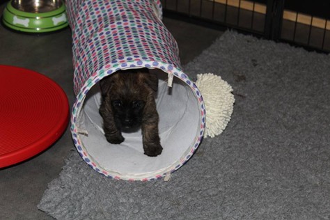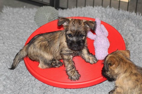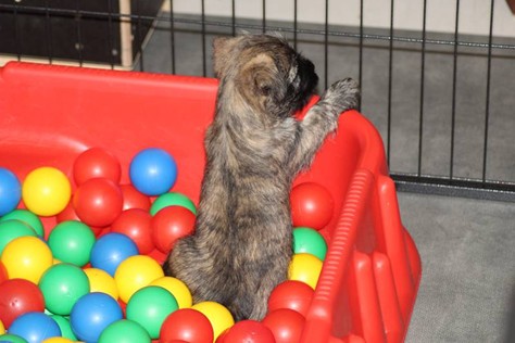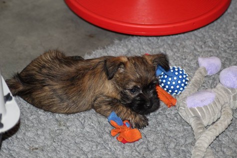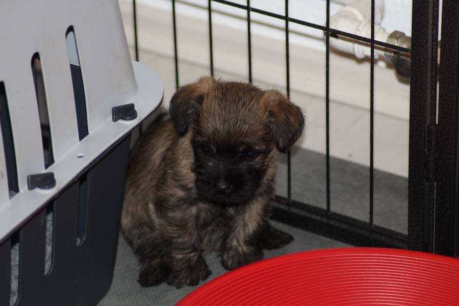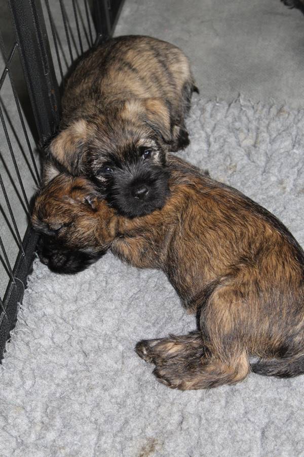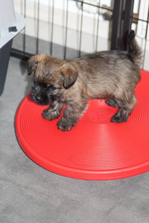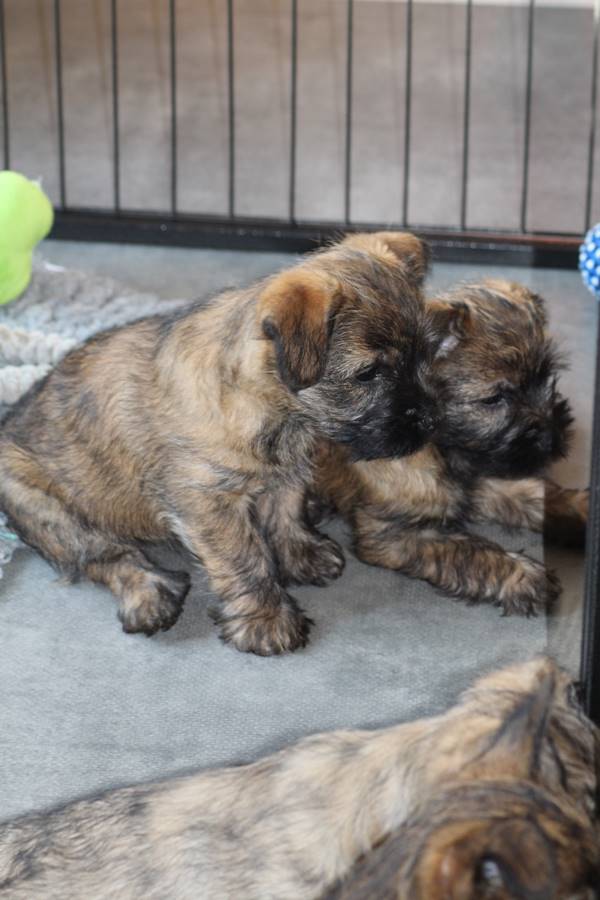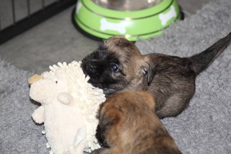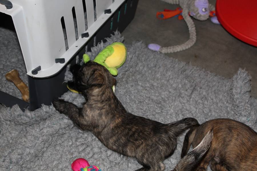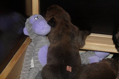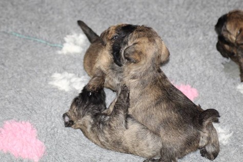 … Inzwischen lebten die sieben Zwerge und ihre Königin beinahe vier Wochen in ihrem wunderschönen Schloss und waren nicht nur sehr groß, sondern auch sehr lebendig geworden. Waren die Kleinen nun nicht damit beschäftigt zu schlafen, so konnte ein reges Treiben in den Mauern des Schlosses wahrgenommen werden: Es wurde nicht nur kräftig gerauft, die sieben Zwerge spielten außerdem sehr gerne mit der goldenen Kugel des Froschkönigs (Ball) oder ließen sich auf das Fußvolk herab, das sich sehr darüber freute, mit den Zwergen zu Spielen und zu Kuscheln. Als Königin Emma jedoch bemerkte, dass das Schloss so allmählich zu klein für die Raufereien ihrer Sprösslinge wurde, beauftragte sie das Fußvolk damit, den Burghof (Welpenauslauf im Wohnzimmer) für Ihre Kinder herzurichten, und so kam es, dass die Zwerge nun neben ihrem Schloss den Burghof zum Herumtollen hatten. Alle amüsierten sich hier prächtig und wenn sie wieder zurück ins gemütliche Schloss kehrten, brachten sie einen Bärenhunger mit. Königin Emma sorgte dann dafür, dass alle Sieben durch das Speisen ihrer köstlichen Milch gesättigt wurden, jedoch reichte diese für den Bärenhunger der Zwerge lange nicht aus. Und so war es die Aufgabe des Fußvolkes für die weitere Verköstigung der sieben Zwerge zu sorgen, indem sie ihnen auf einem silbernen Tablett (Napf) eine köstliche Mahlzeit (Beikost) servierten...