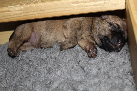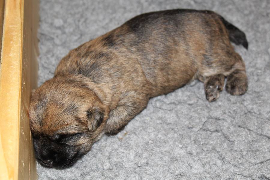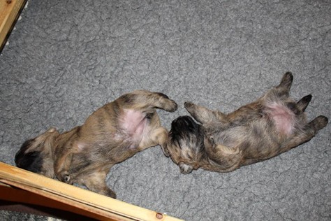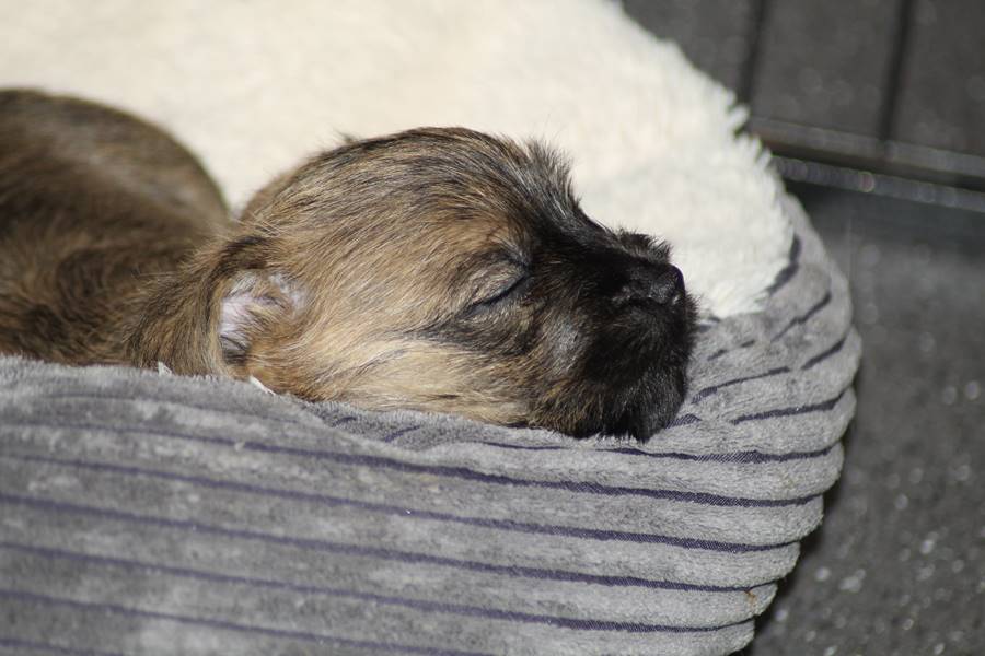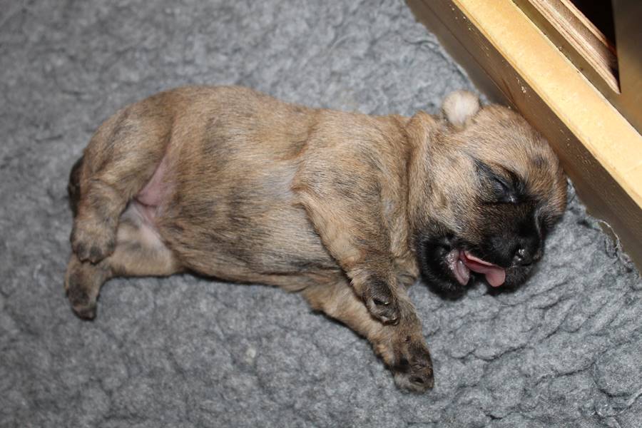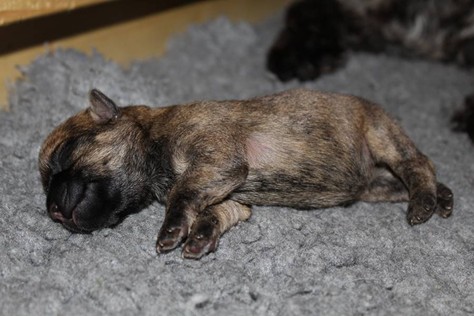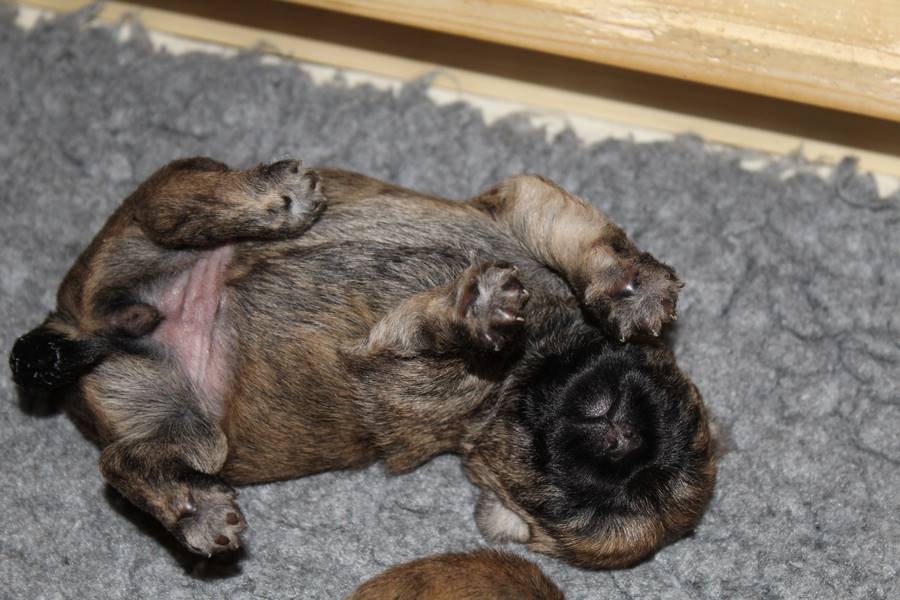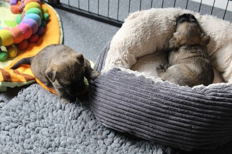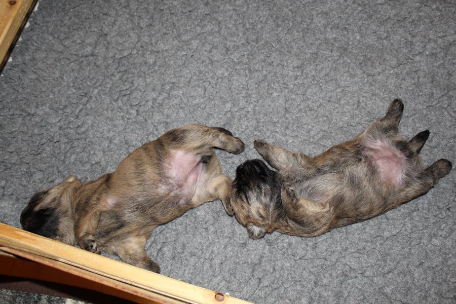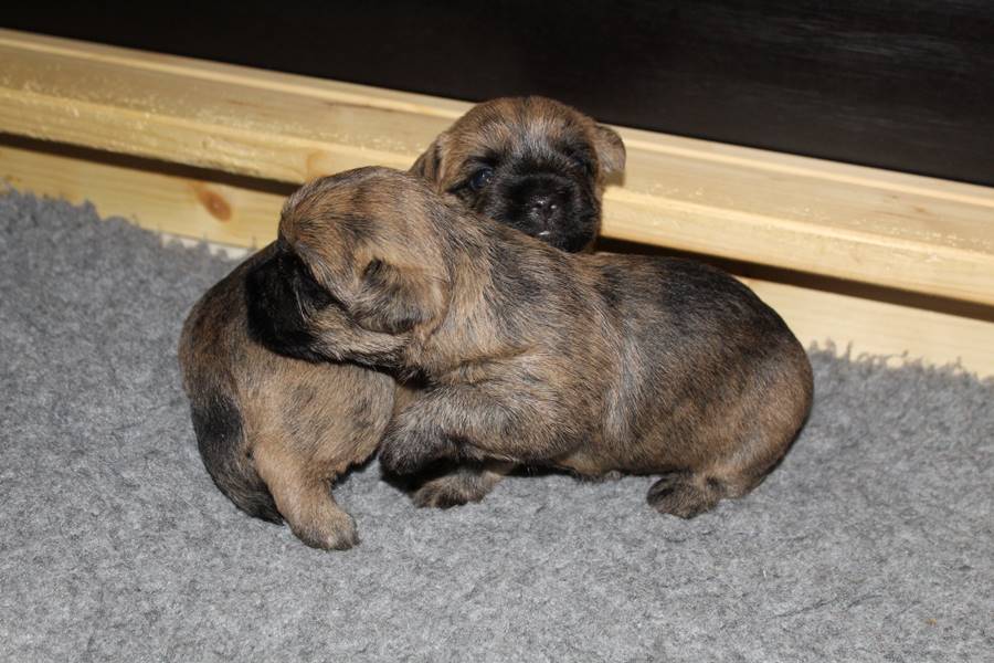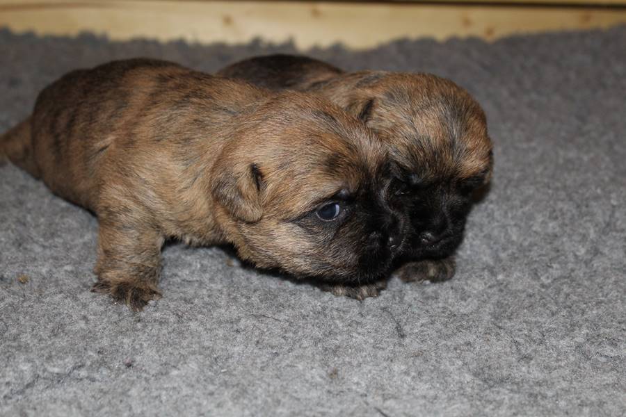 Auch in der zweiten Woche waren Schlafen und Essen die Hauptattraktionen in der Wurfkiste. So konnten beide Welpen schon am siebten Tag ihr Geburtsgewicht verdoppeln. Die Milch von Mama Gwenny schmeckt halt einfach zu gut. Aber so langsam wollen die Kleinen doch wissen, ob die Welt noch mehr für sie zu bieten hat und so öffneten sie 12 Tage nach ihrer Geburt fast gleichzeitig ihre Augen.