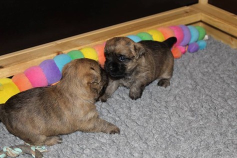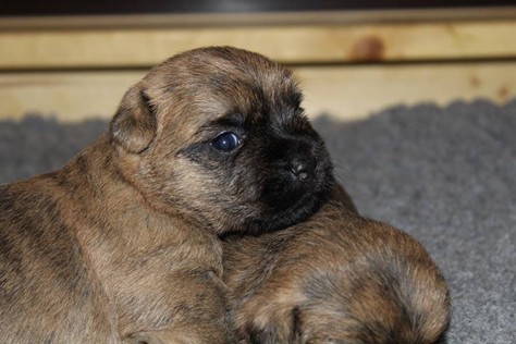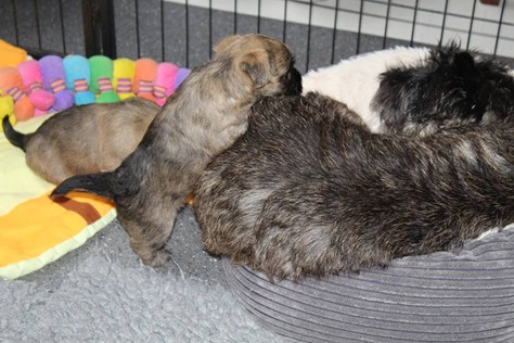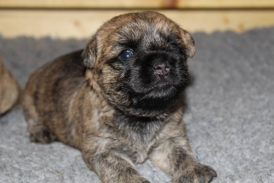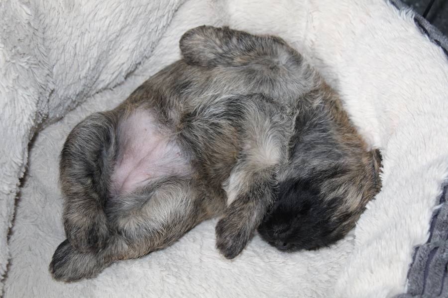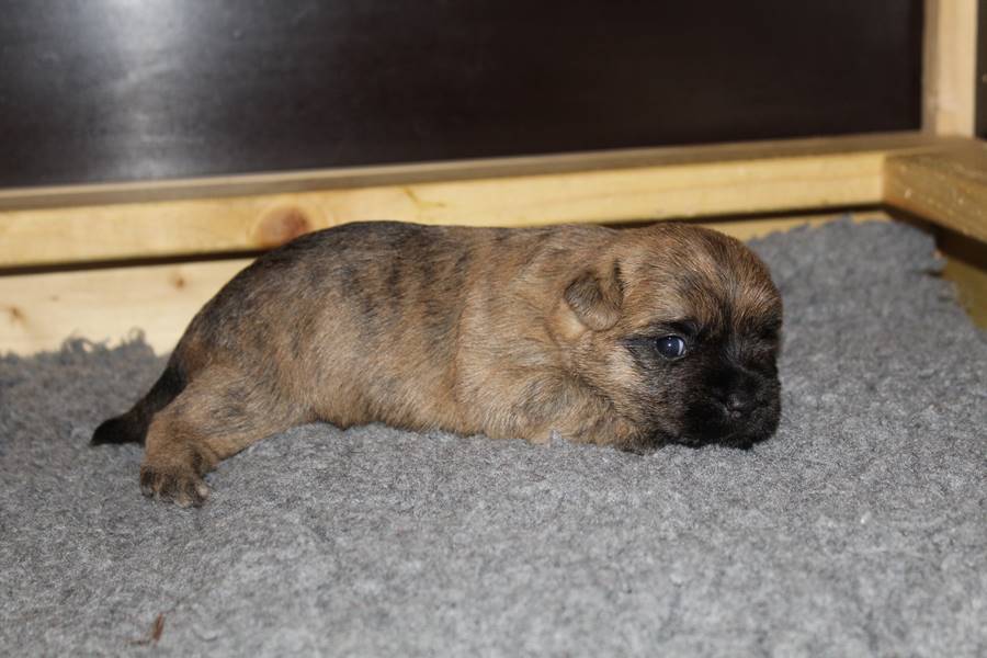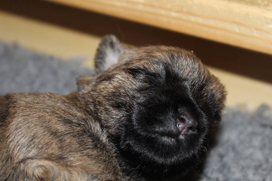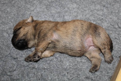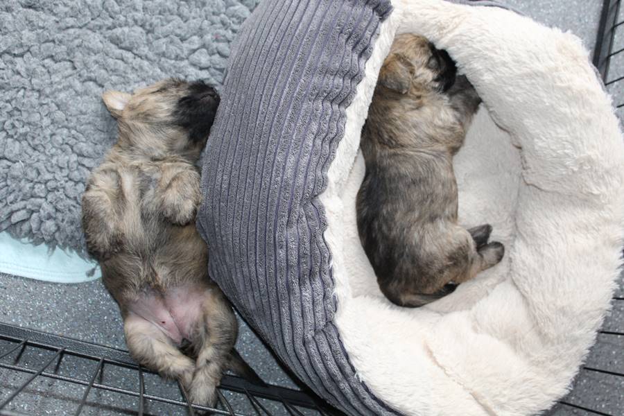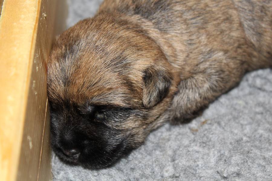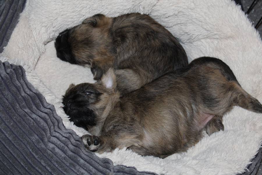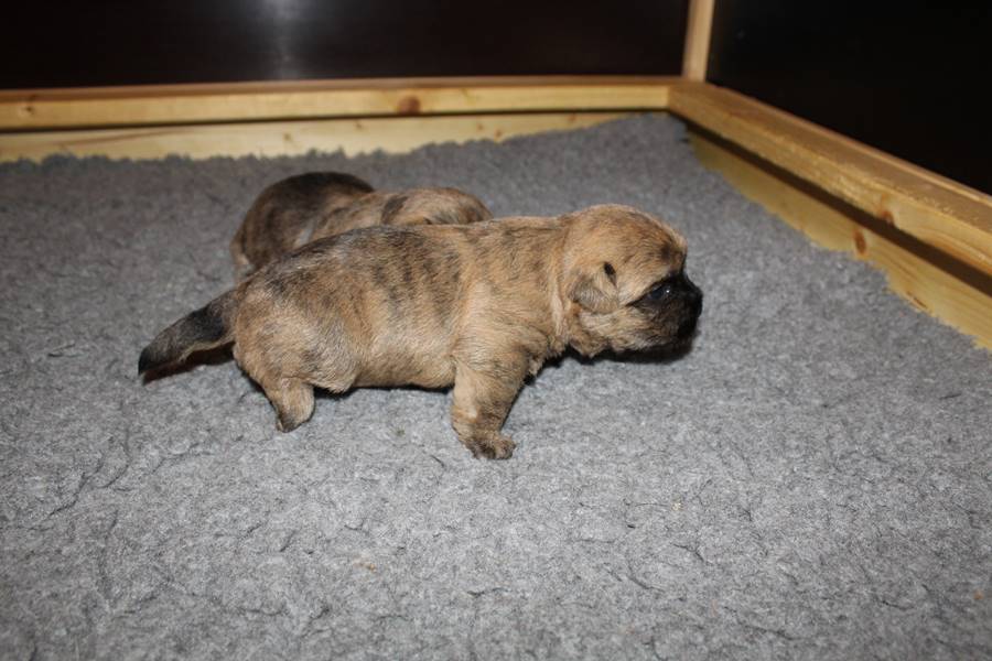 Auch in der zweiten Woche waren Schlafen und Essen die Hauptattraktionen in der Wurfkiste. So konnten beide Welpen schon am siebten Tag ihr Geburtsgewicht verdoppeln. Die Milch von Mama Gwenny schmeckt halt einfach zu gut. Aber so langsam wollen die Kleinen doch wissen, ob die Welt noch mehr für sie zu bieten hat und so öffneten sie 12 Tage nach ihrer Geburt fast gleichzeitig ihre Augen.