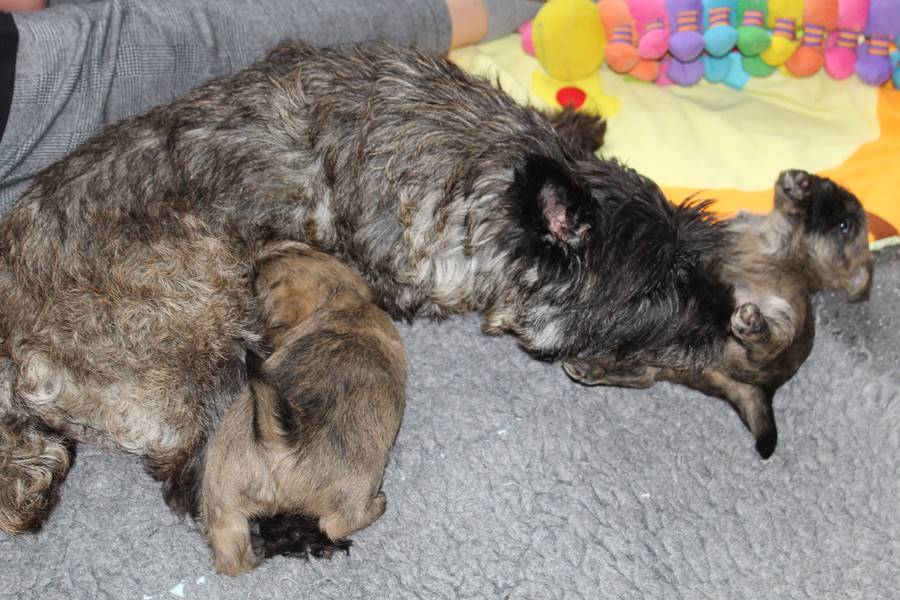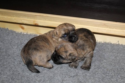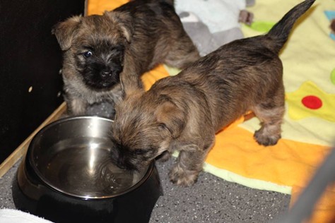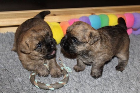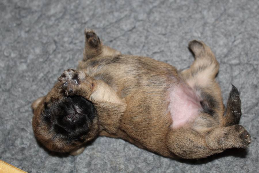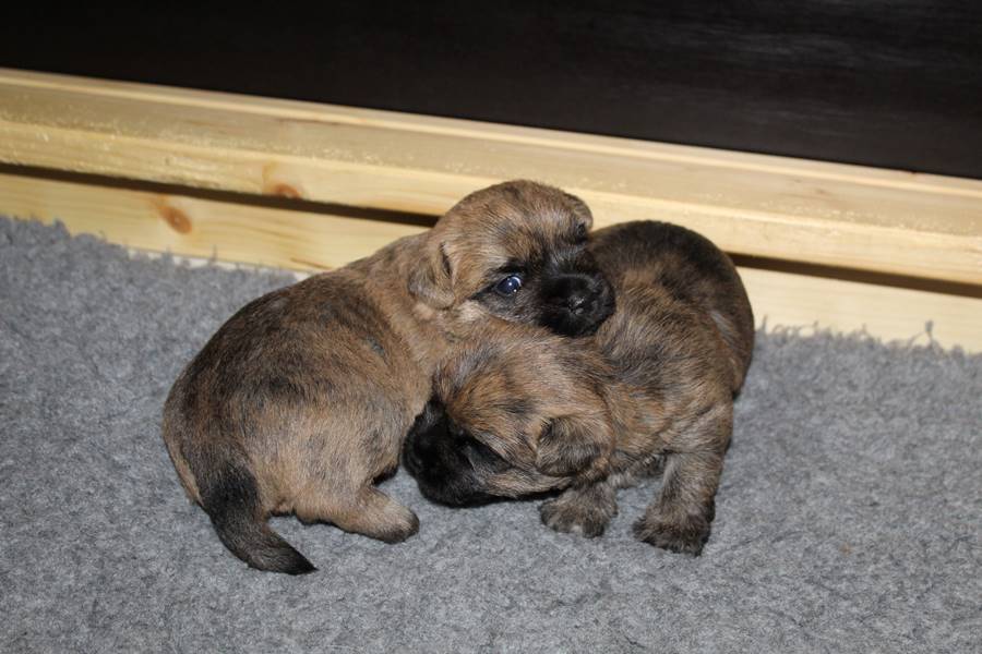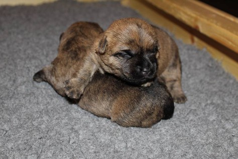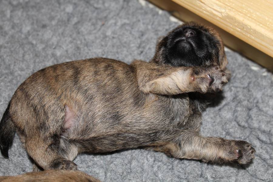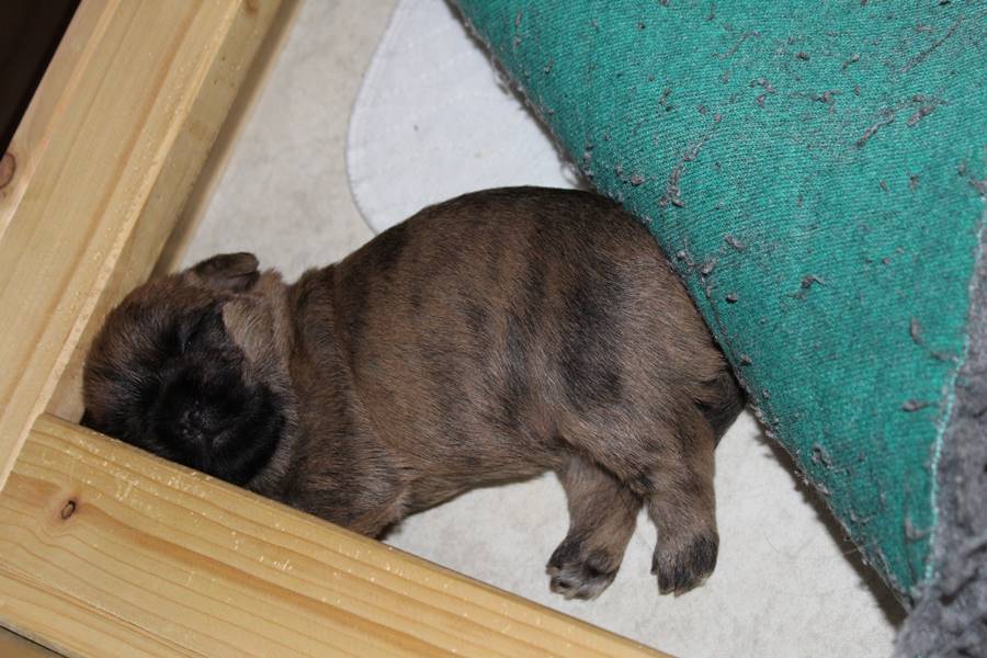 Die Welpen haben ihre Äuglein jetzt schon fast eine Woche lang offen und fangen langsam an scharf zu sehen. Dies eröffnet ihnen völlig neue Perspektiven bei der Erkundung der Wurfkiste, manchmal sogar außerhalb der Wurfkiste, wenn man dringend zu Mami will, sie aber davor liegt. Auch sind die Kleinen mittlerweile schon relativ gut auf vier Beinen unterwegs. Trotz des erhöhten Energiebedarfs durch die körperliche Betätigung, haben die Beiden auch in dieser Woche wieder gut an Gewicht zulegen können.