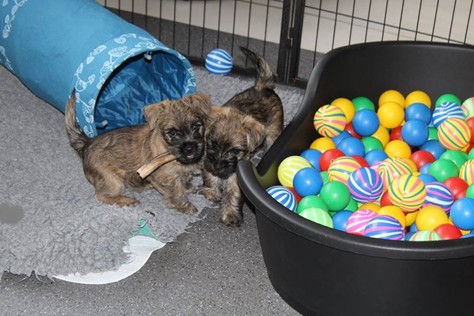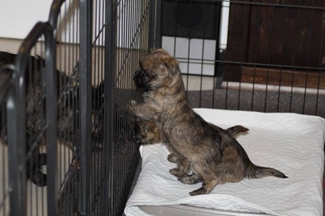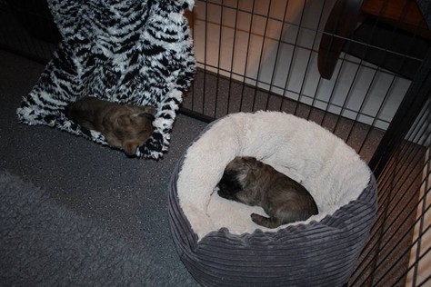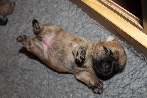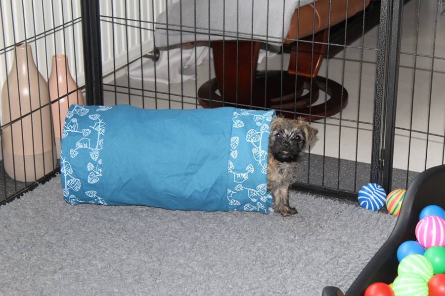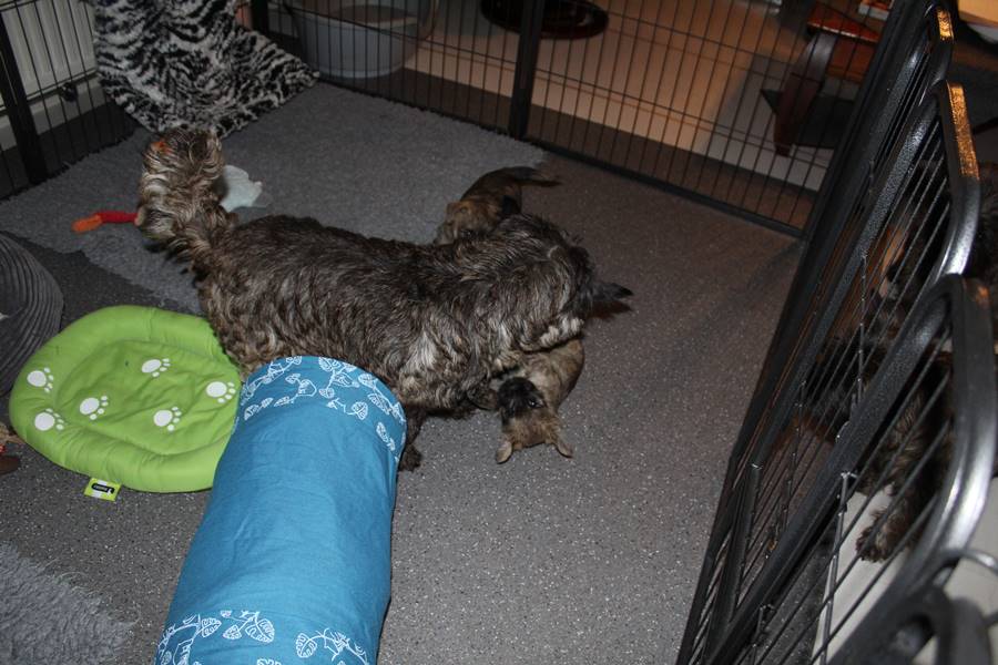 Puh, das war ein ganz schön anstrengendes Wochenende! Am Samstag-Morgen sind die Welpen mitsamt Mama Gwenny in das Wohnzimmer umgezogen. Jetzt haben sie viel mehr Platz zum Spielen und Toben. Kaum hatten sie sich auch schon an die neue Umgebung gewöhnt, bekamen die Beiden am Sonntag-Nachmittag Besuch. Das fanden sie sehr toll, denn der Besuch schenkte ihnen seine ganze Aufmerksamkeit und spielte mit den Kleinen. Da waren sie am Abend echt geschafft.