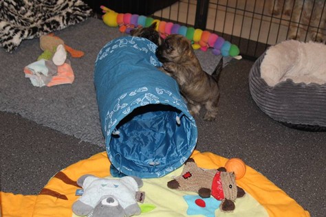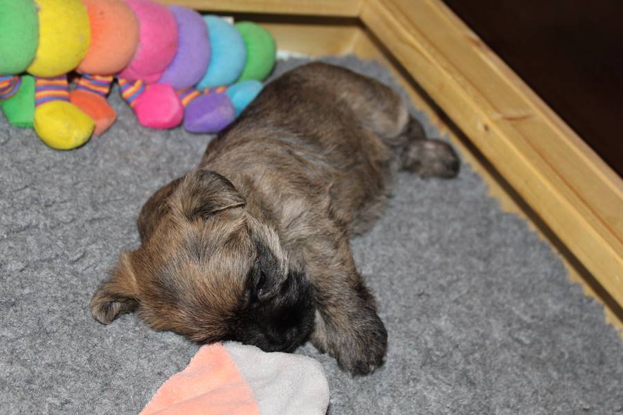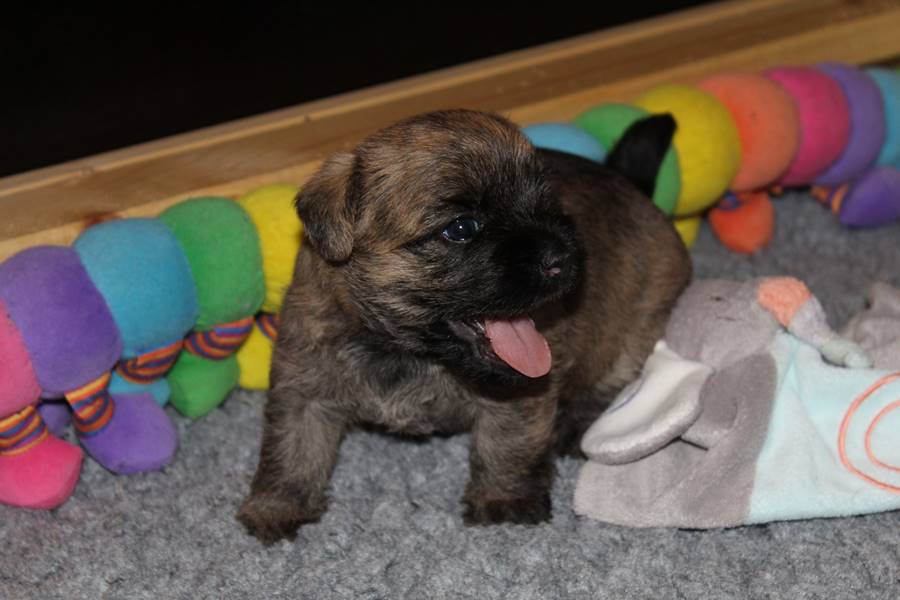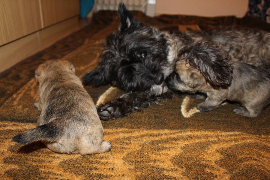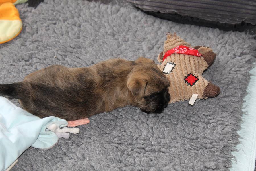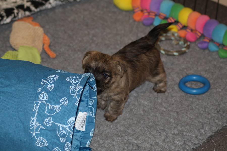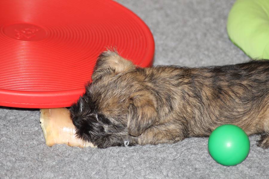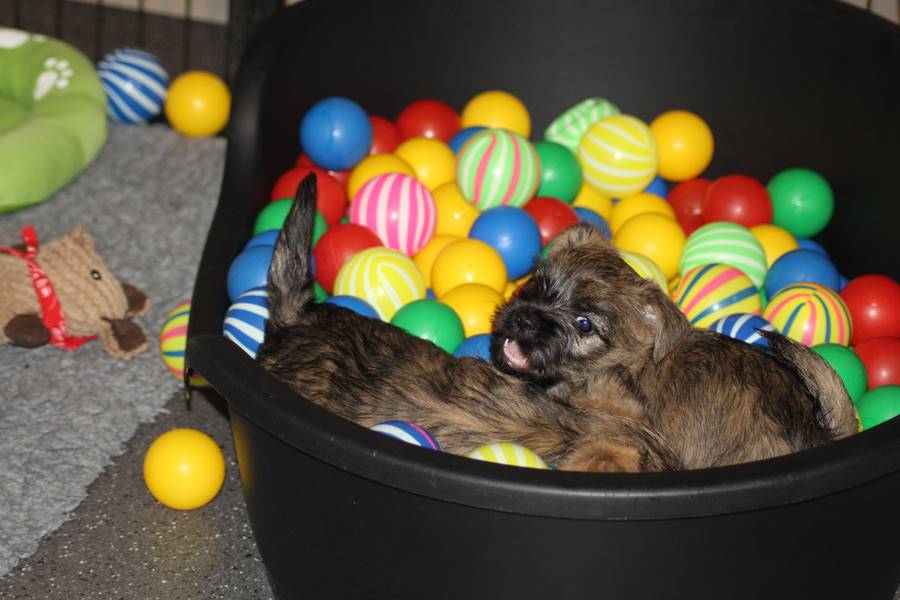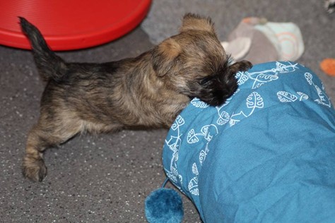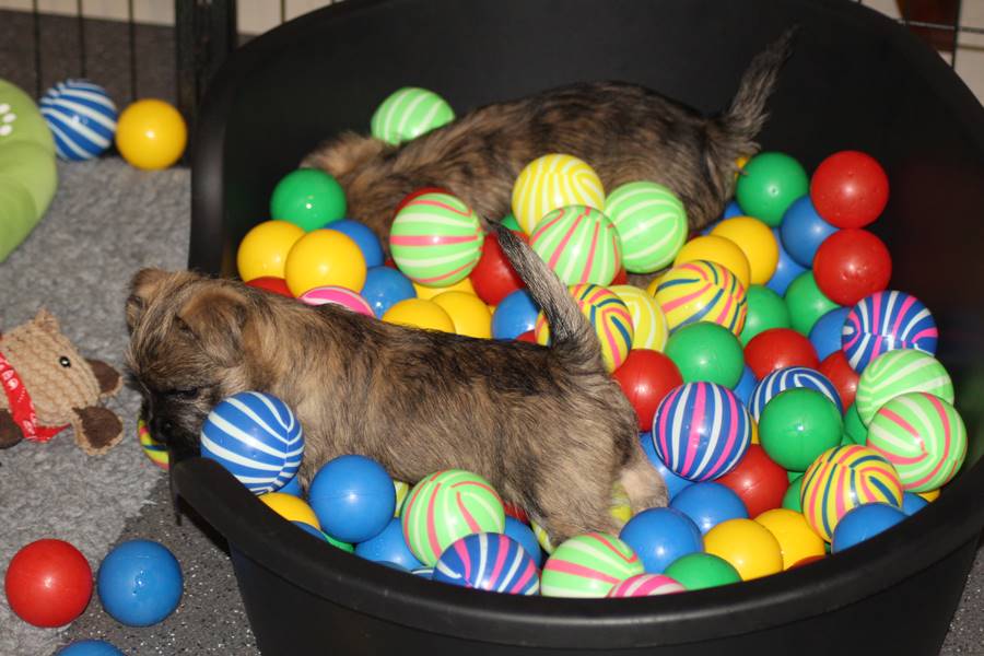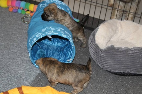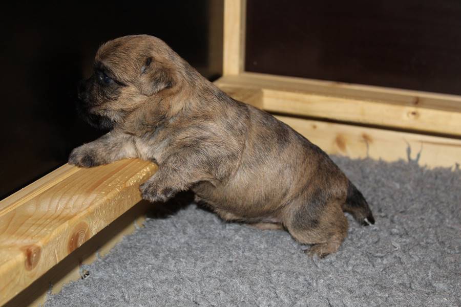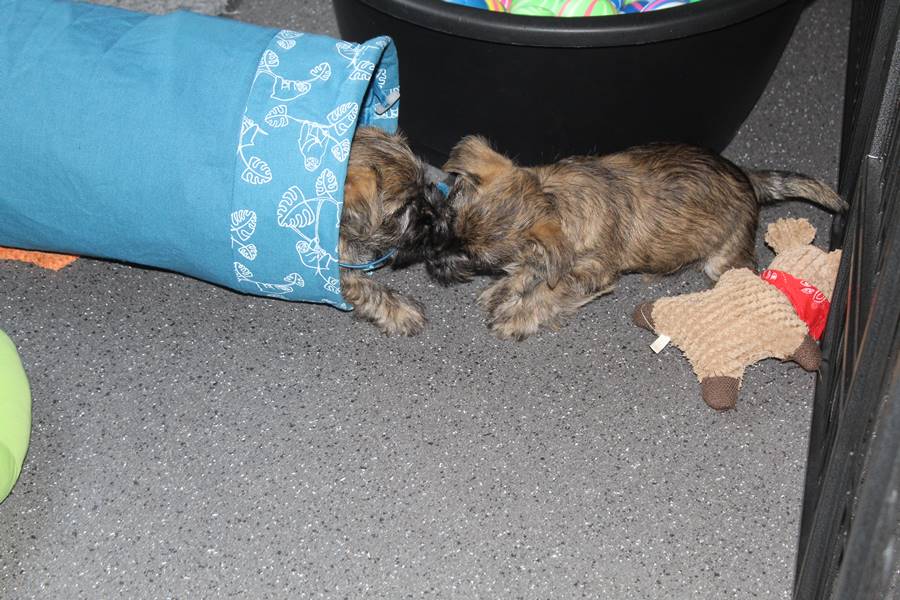 Auch in dieser Woche sind die Welpen wieder mächtig groß geworden. Sie spielen und toben jetzt schon immer länger und öfter mit einander und manchmal spielt sogar Mama Gwenny mit. Außerdem durften die Kleinen auch schon die große weite Welt außerhalb der Wurfkiste erkunden.