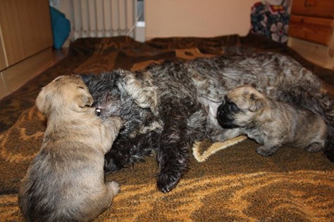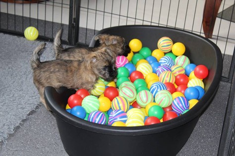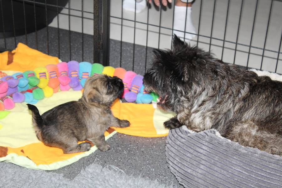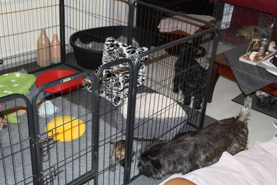Mittlerweile haben sich die Mädels in ihrem neuen Zuhause schon richtig gut eingelebt. Erste Ausbruchsversuche aus ihrem Auslauf in das Wohnzimmer sind auch schon geglückt. Mama Gwenny geht inzwischen immer seltener zu ihren Schützlingen, um ihnen Milch zu geben, da die Zähnchen der Kleinen doch ganz schön weh tun können. Aber sie fressen die Babykost auch schon sehr gern. Auch den Rest des Rudels haben die Babys kennengelernt. Jetzt müssen sie gut auf ihre Spielsachen aufpassen, dass sie nicht geklaut werden.