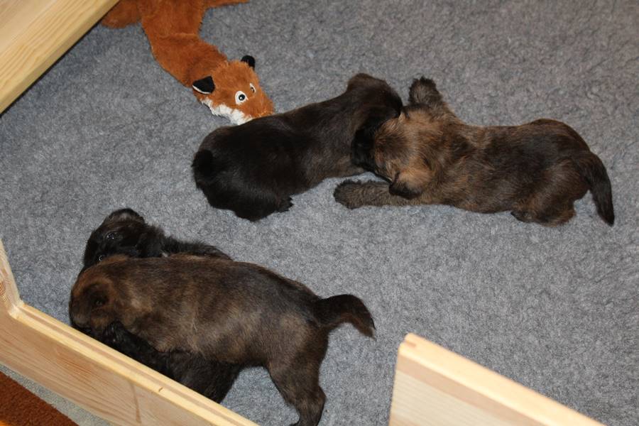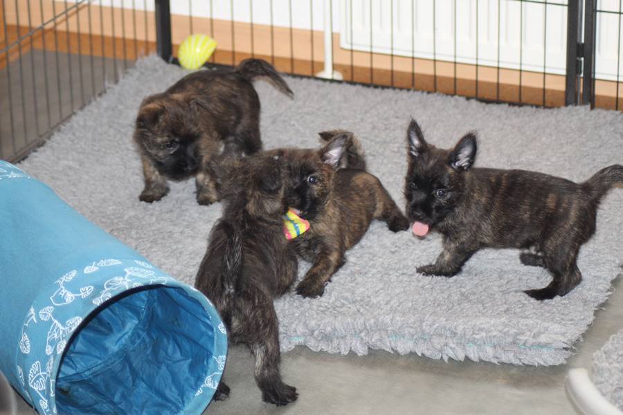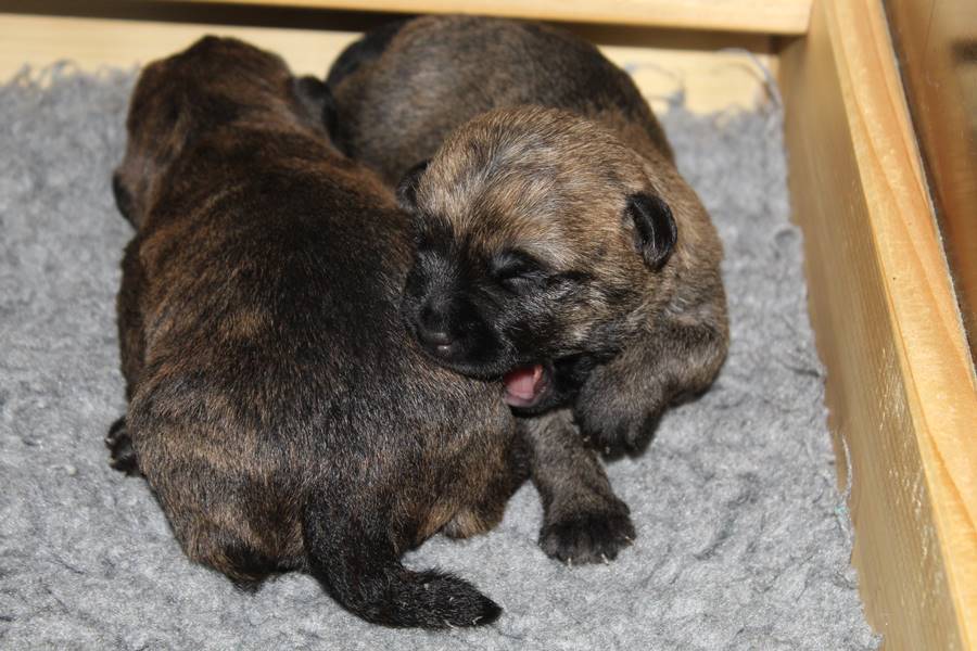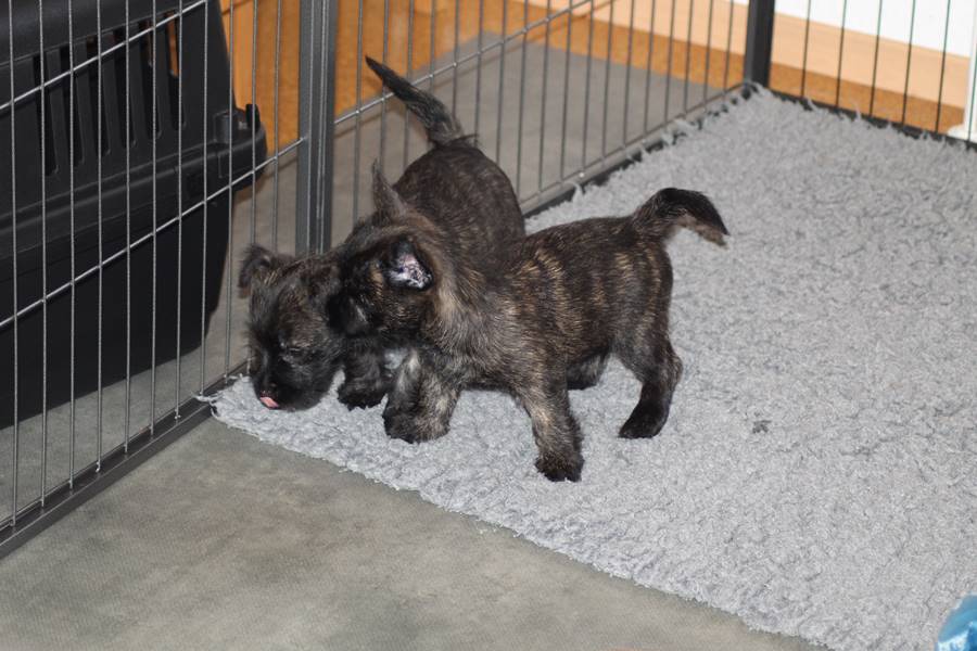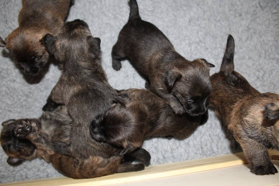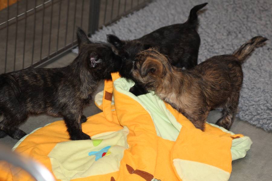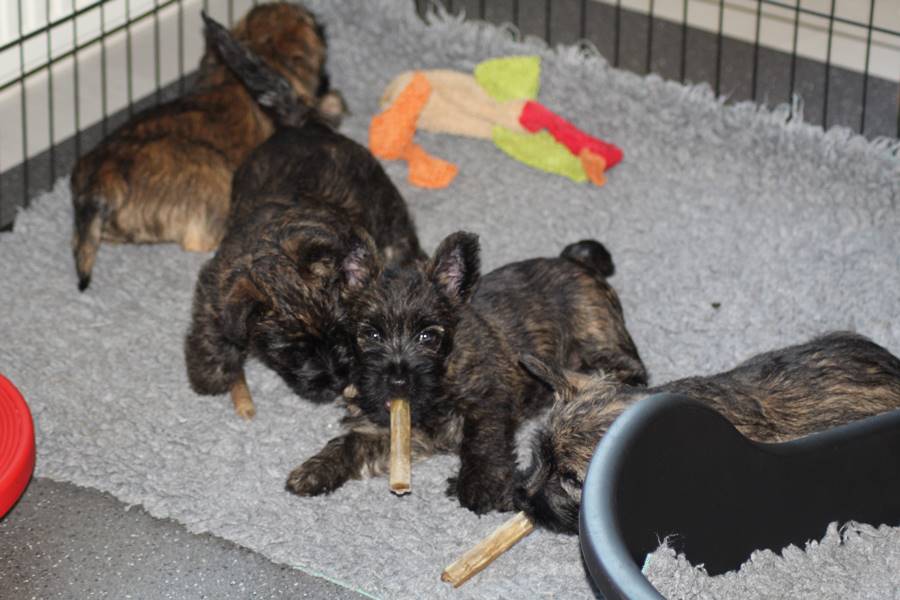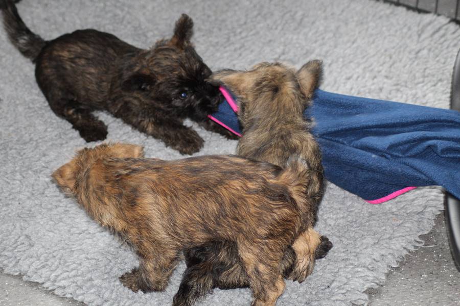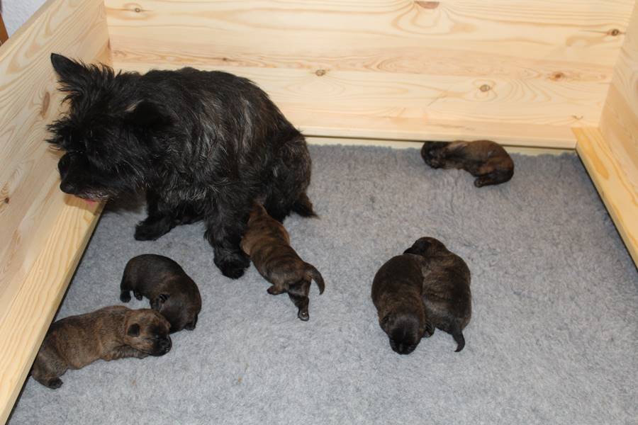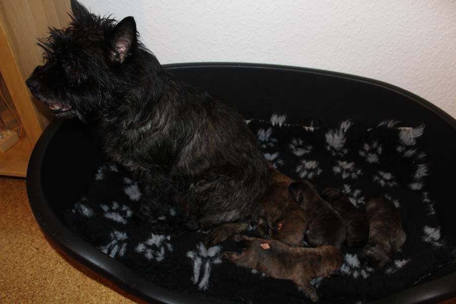 Da das Wetter momentan wieder so schlecht ist, dass die Kleinen nicht nach draußen können, toben sie drinnen umso wilder. Vergangene Woche ging die Reise mit dem Auto zum Tierarzt. Alle waren während der halbstündigen Fahrt recht brav. Beim Tierarzt zeigten sie, was ein echter Cairn-Terrier ist - Kein einziges Quieken. Die Zehn waren das Highlight der Tierarztpraxis. Alle wollten sie anschauen.