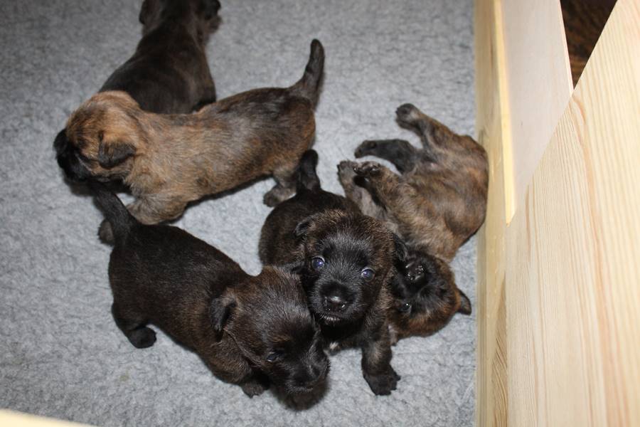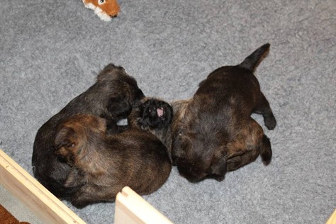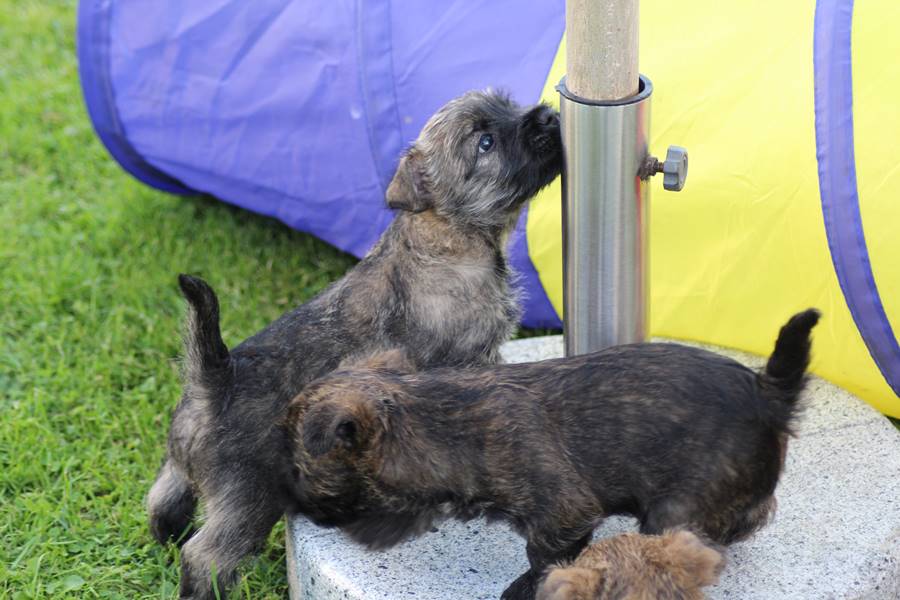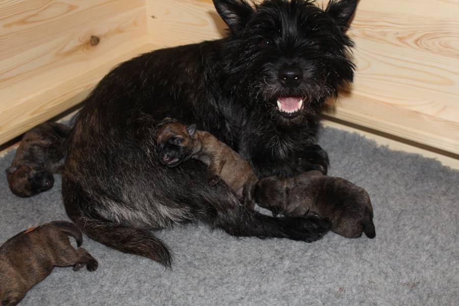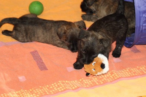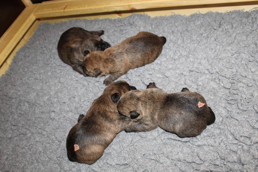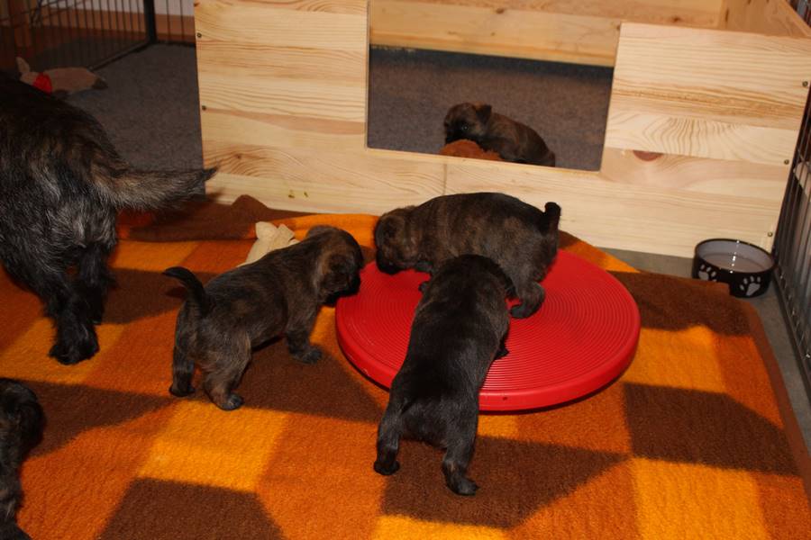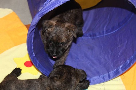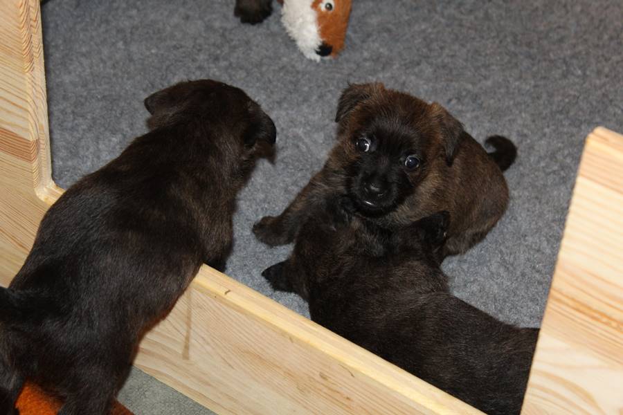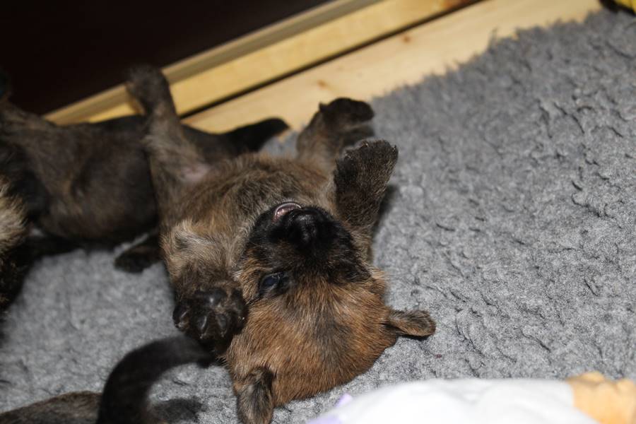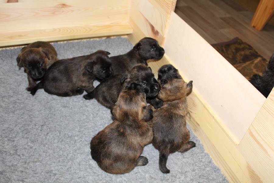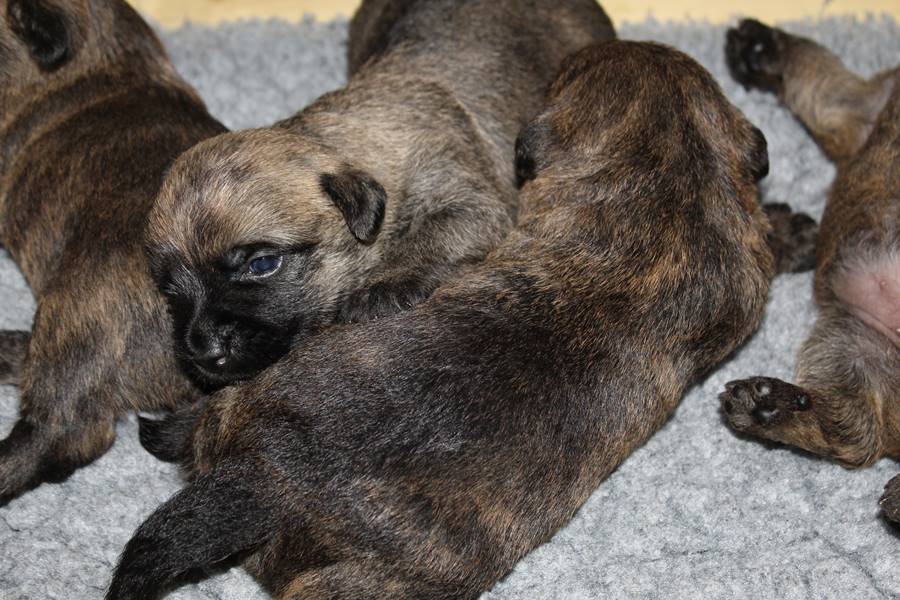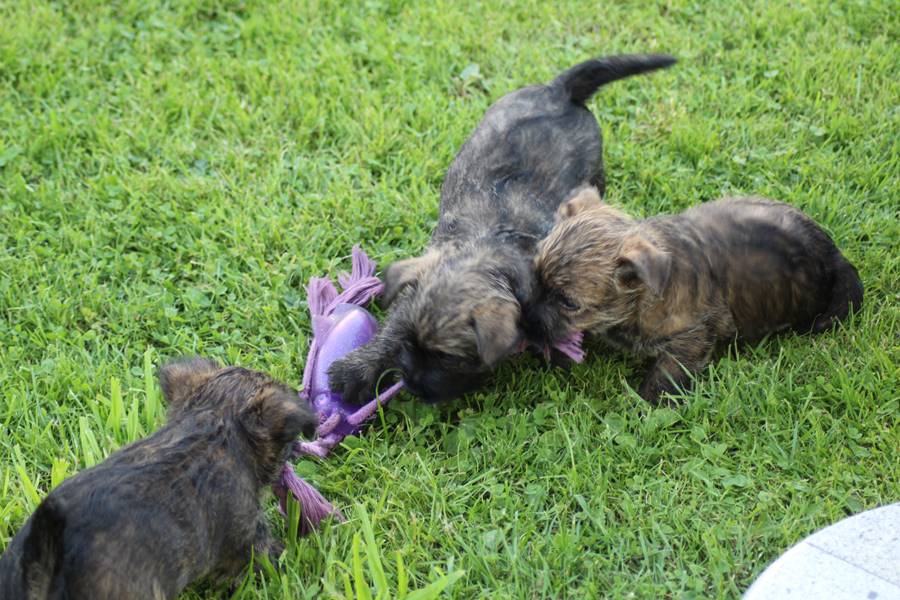 Da das Wetter momentan wieder so schlecht ist, dass die Kleinen nicht nach draußen können, toben sie drinnen umso wilder. Vergangene Woche ging die Reise mit dem Auto zum Tierarzt. Alle waren während der halbstündigen Fahrt recht brav. Beim Tierarzt zeigten sie, was ein echter Cairn-Terrier ist - Kein einziges Quieken. Die Zehn waren das Highlight der Tierarztpraxis. Alle wollten sie anschauen.