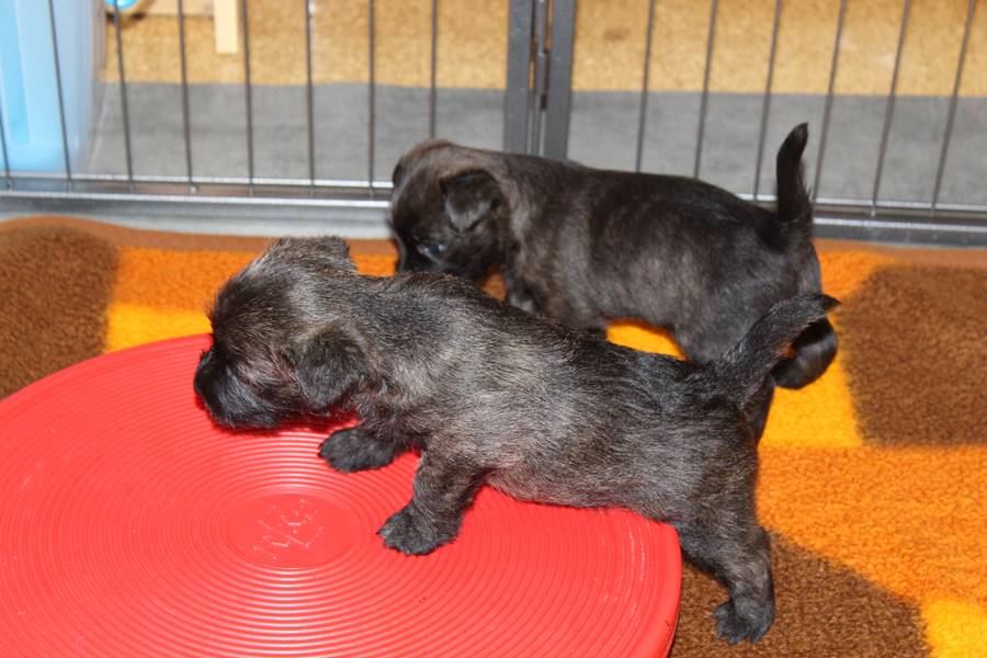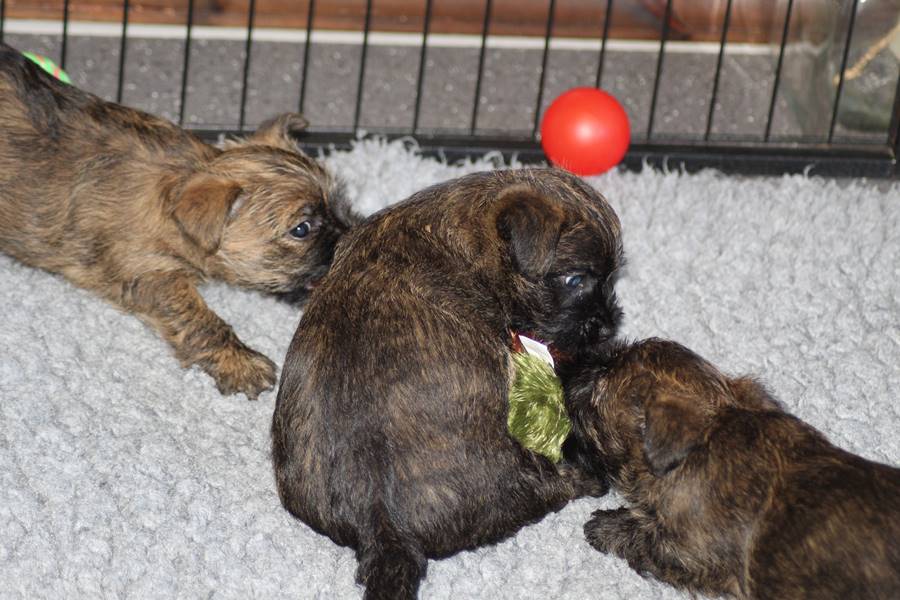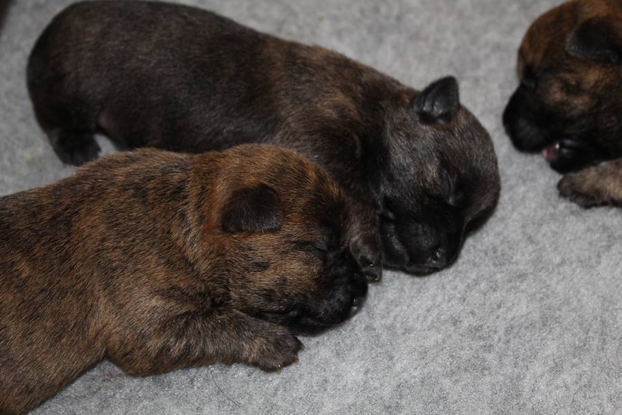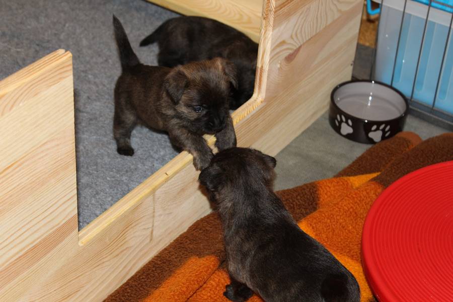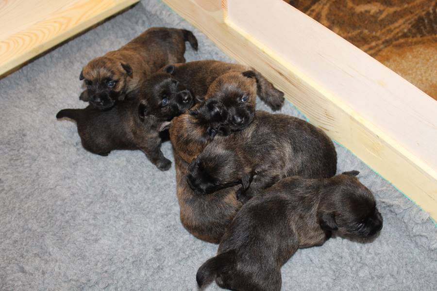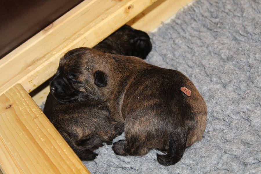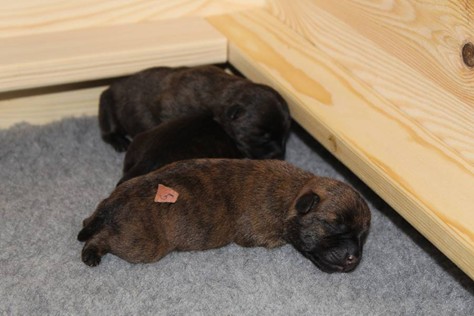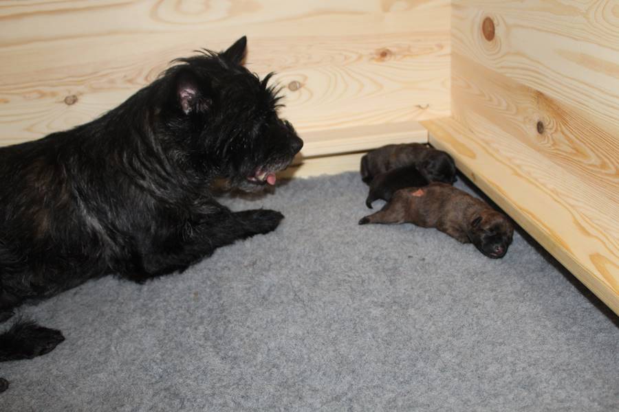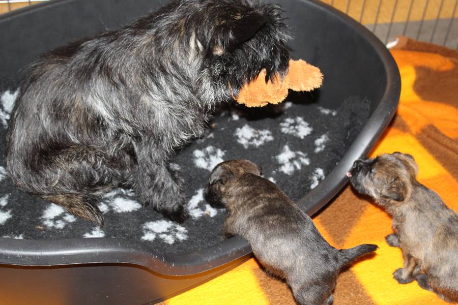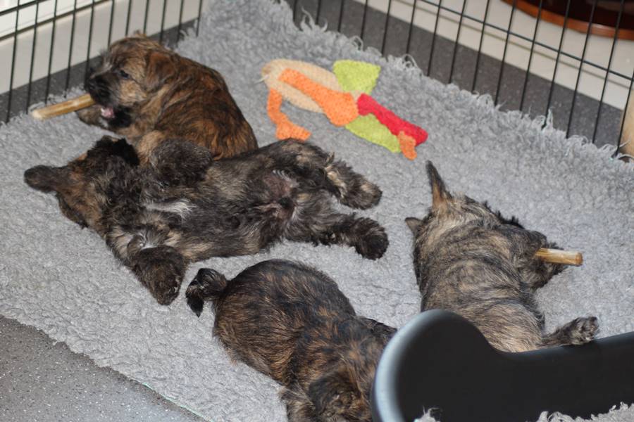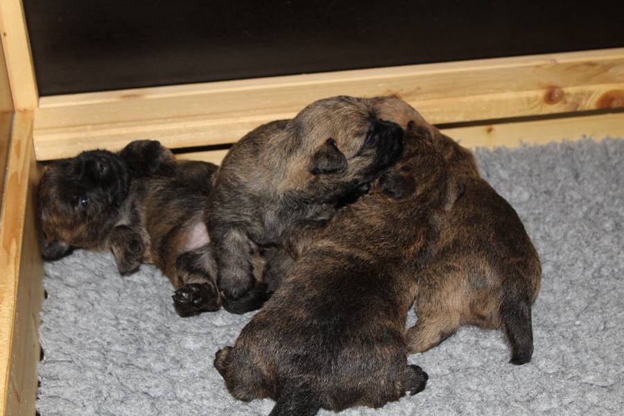 Da das Wetter momentan wieder so schlecht ist, dass die Kleinen nicht nach draußen können, toben sie drinnen umso wilder. Vergangene Woche ging die Reise mit dem Auto zum Tierarzt. Alle waren während der halbstündigen Fahrt recht brav. Beim Tierarzt zeigten sie, was ein echter Cairn-Terrier ist - Kein einziges Quieken. Die Zehn waren das Highlight der Tierarztpraxis. Alle wollten sie anschauen.