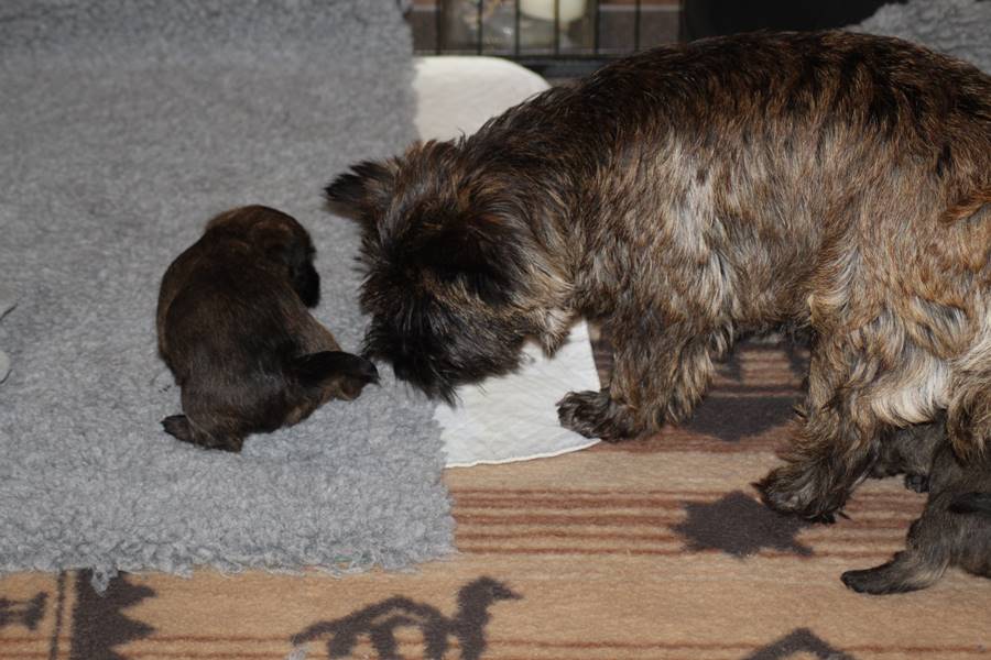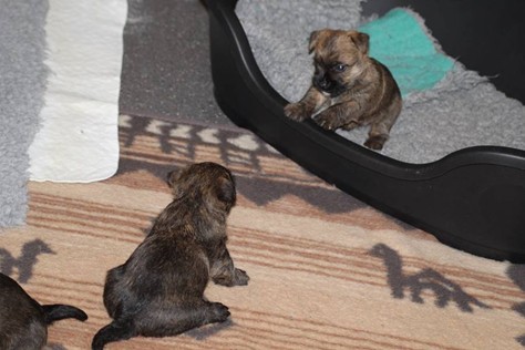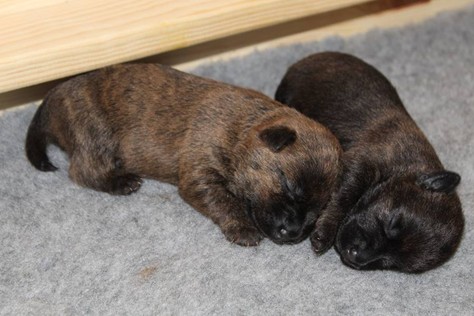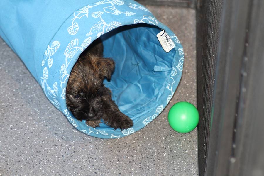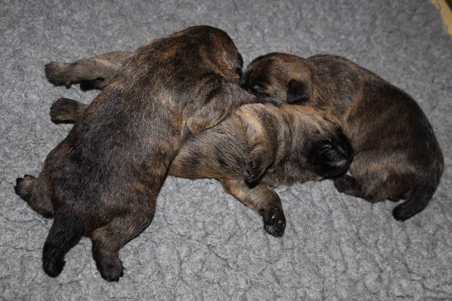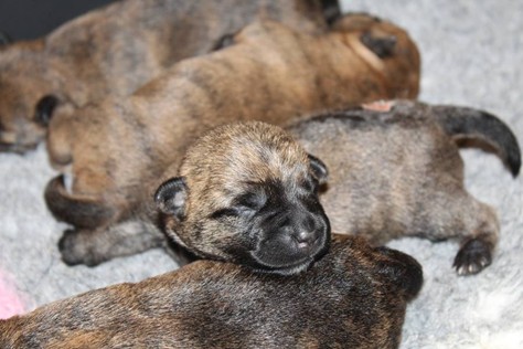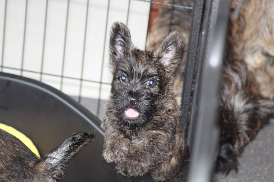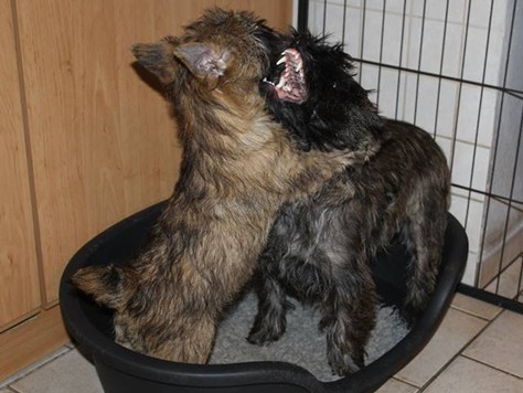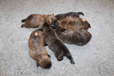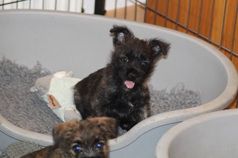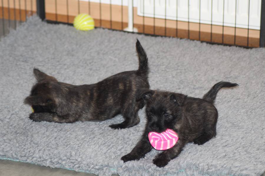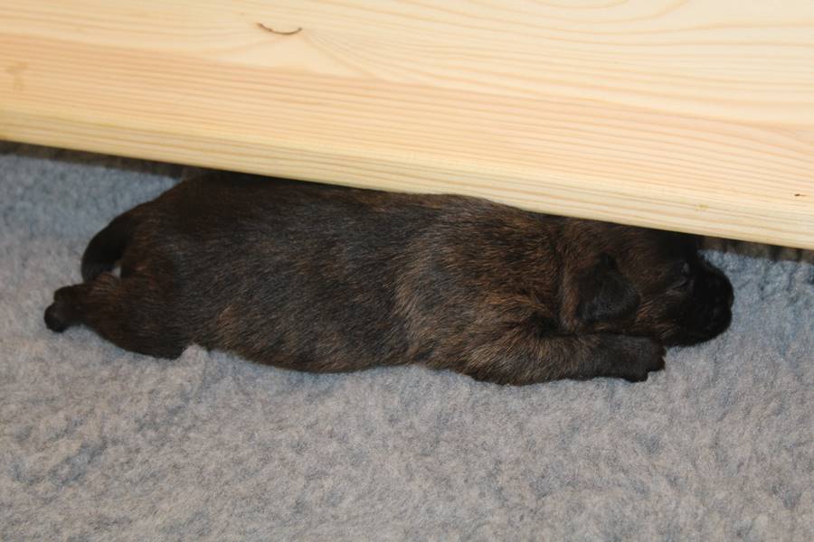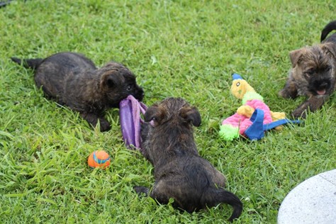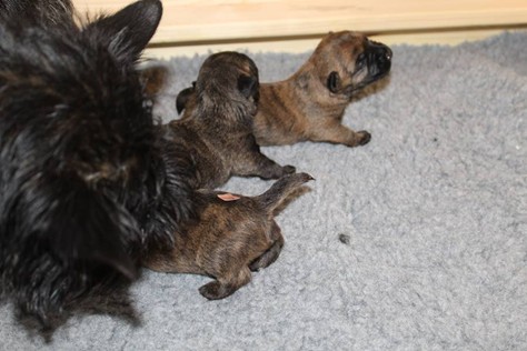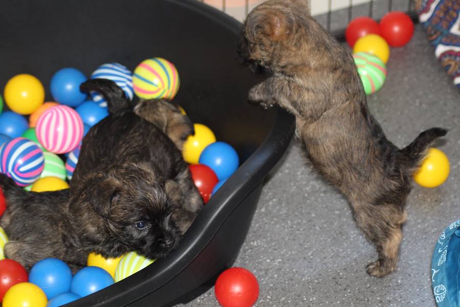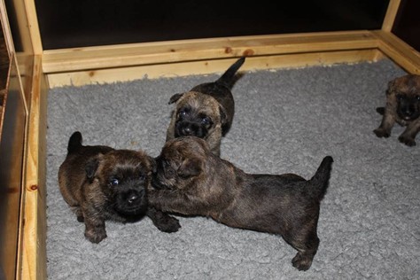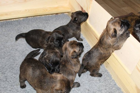 Da das Wetter momentan wieder so schlecht ist, dass die Kleinen nicht nach draußen können, toben sie drinnen umso wilder. Vergangene Woche ging die Reise mit dem Auto zum Tierarzt. Alle waren während der halbstündigen Fahrt recht brav. Beim Tierarzt zeigten sie, was ein echter Cairn-Terrier ist - Kein einziges Quieken. Die Zehn waren das Highlight der Tierarztpraxis. Alle wollten sie anschauen.