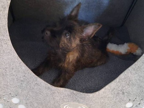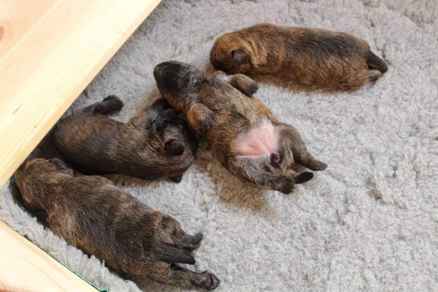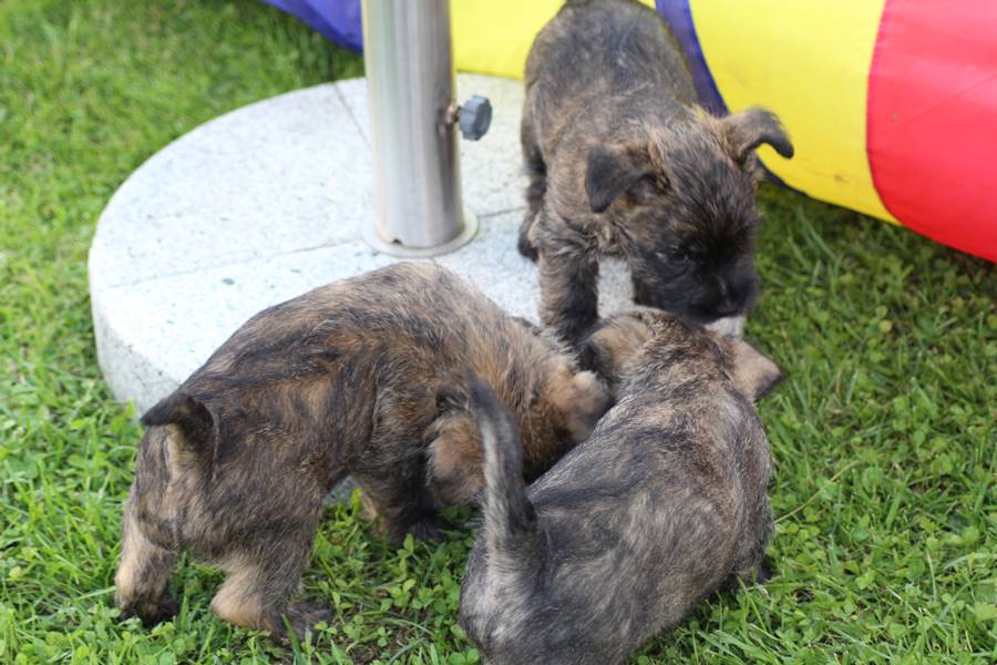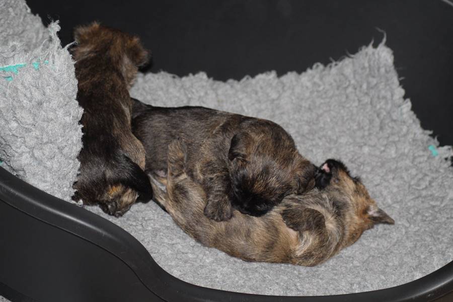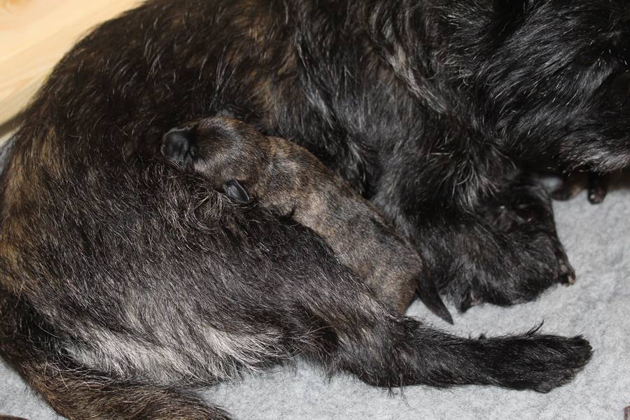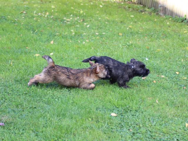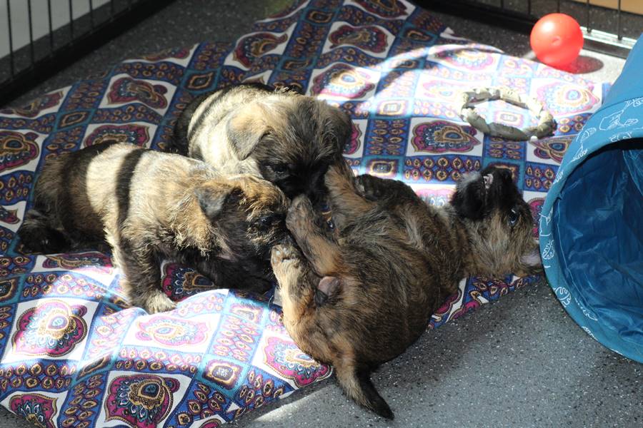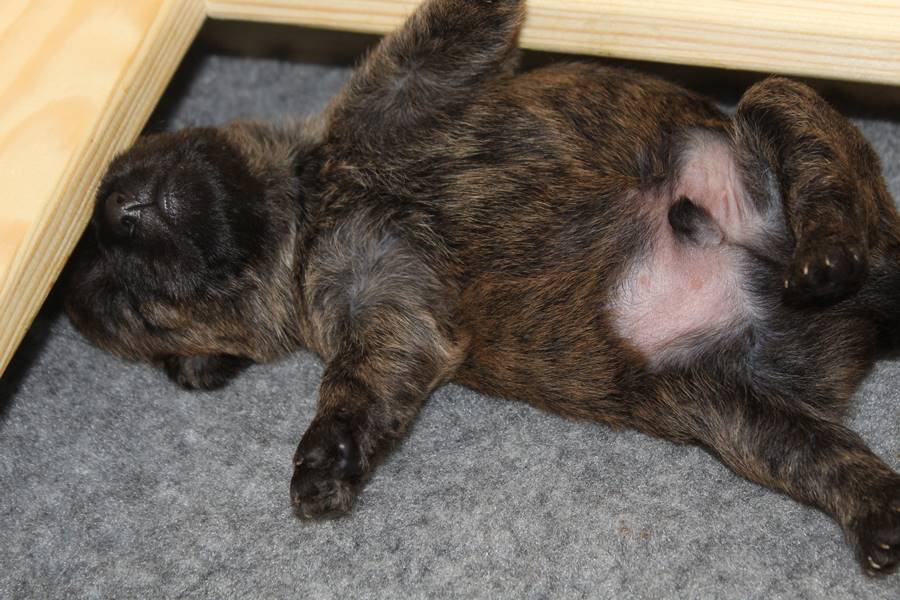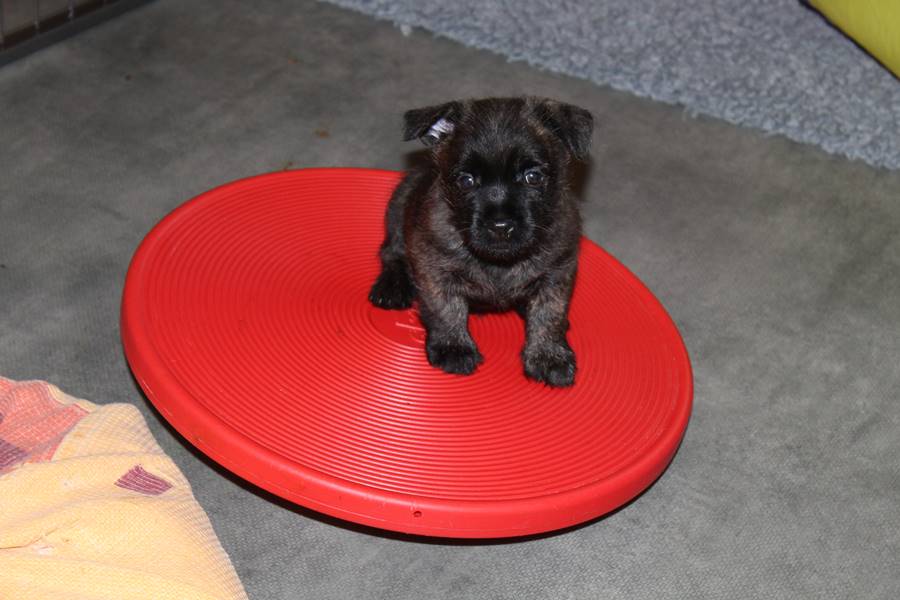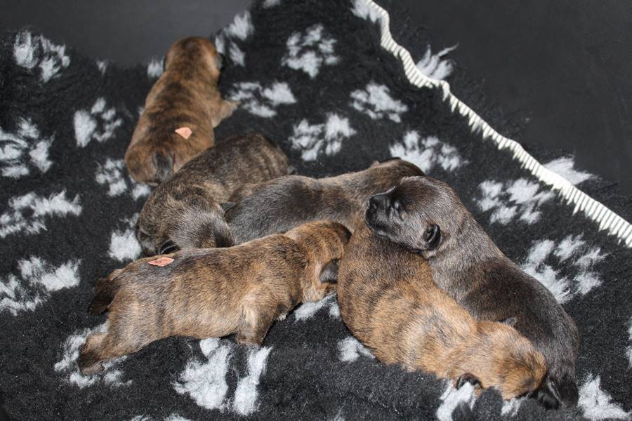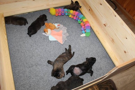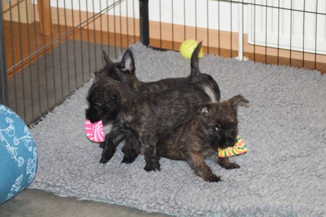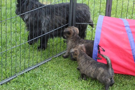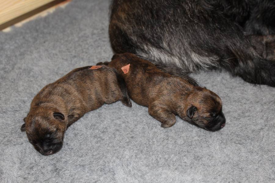 Da das Wetter momentan wieder so schlecht ist, dass die Kleinen nicht nach draußen können, toben sie drinnen umso wilder. Vergangene Woche ging die Reise mit dem Auto zum Tierarzt. Alle waren während der halbstündigen Fahrt recht brav. Beim Tierarzt zeigten sie, was ein echter Cairn-Terrier ist - Kein einziges Quieken. Die Zehn waren das Highlight der Tierarztpraxis. Alle wollten sie anschauen.