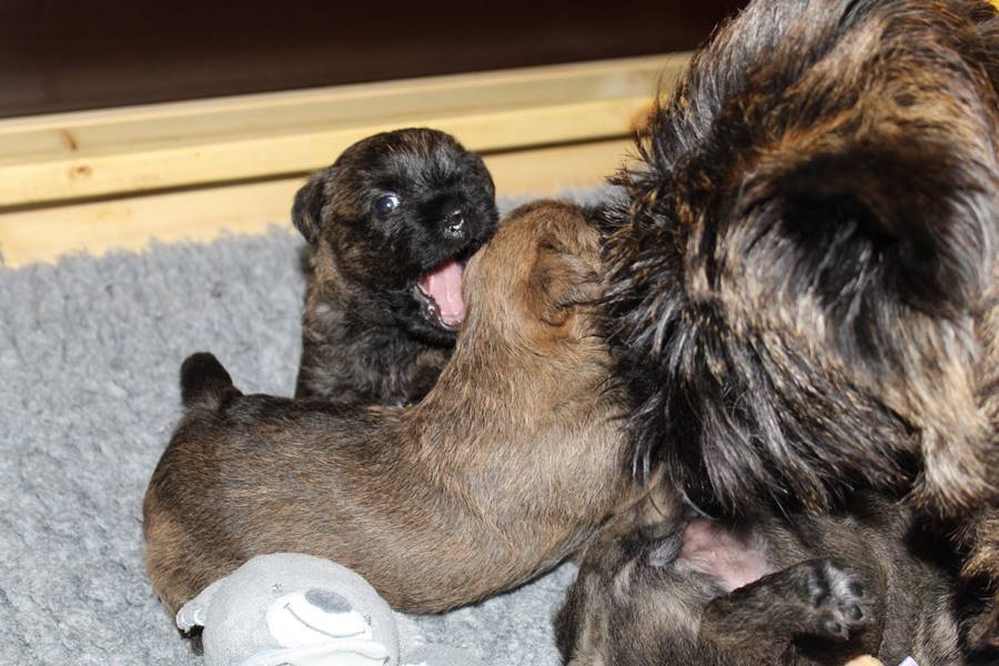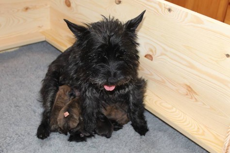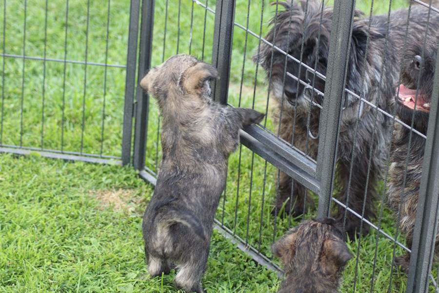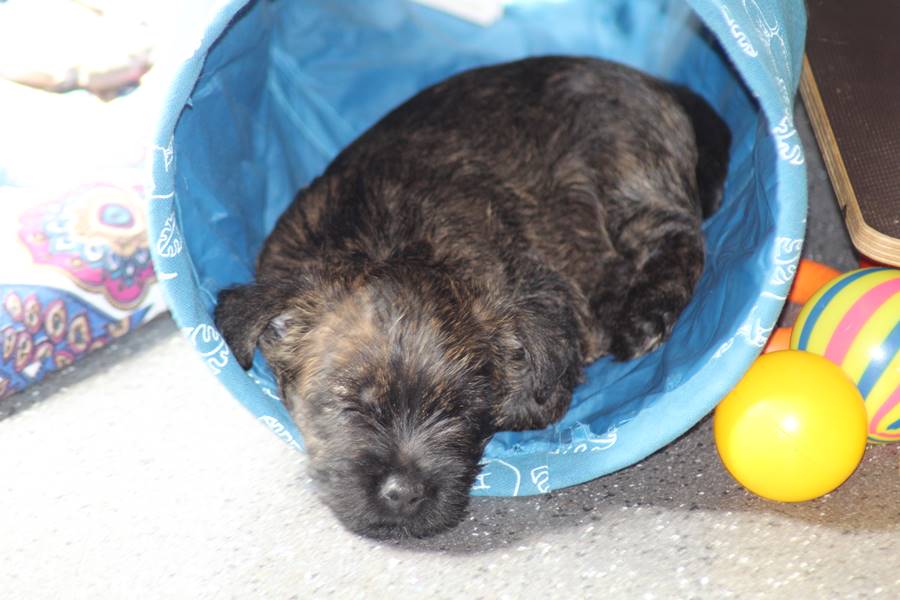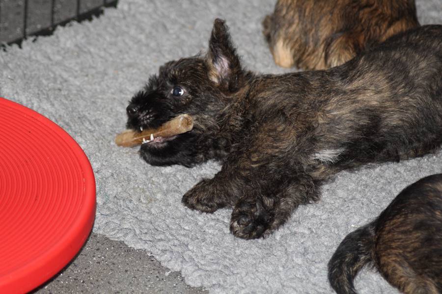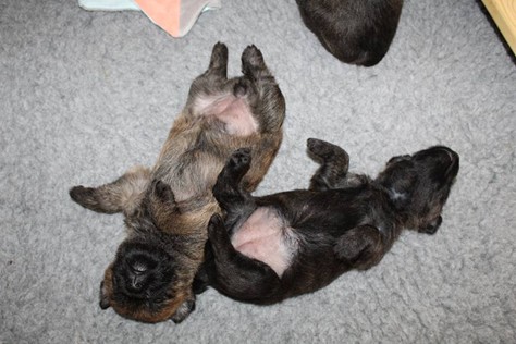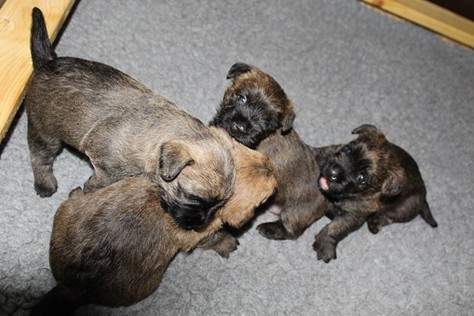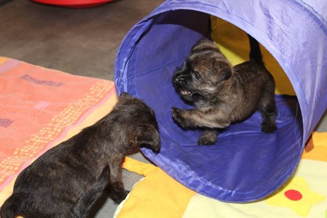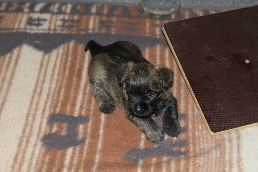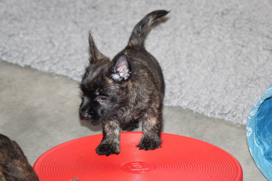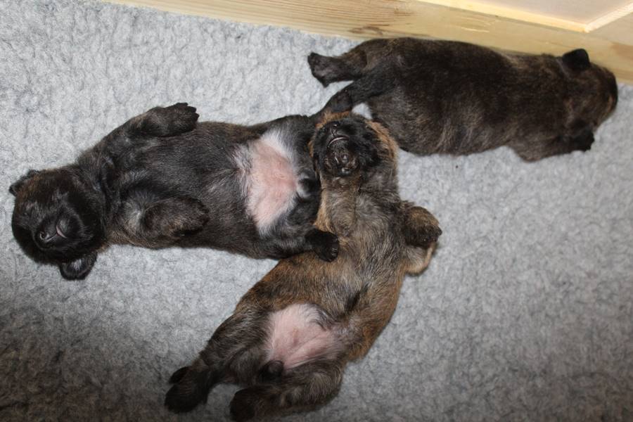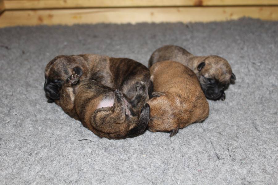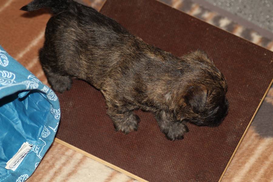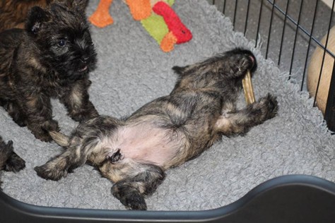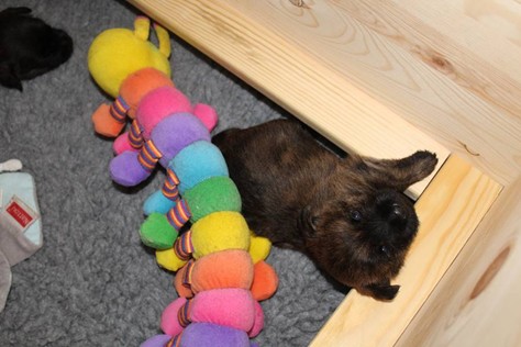Da das Wetter momentan wieder so schlecht ist, dass die Kleinen nicht nach draußen können, toben sie drinnen umso wilder. Vergangene Woche ging die Reise mit dem Auto zum Tierarzt. Alle waren während der halbstündigen Fahrt recht brav. Beim Tierarzt zeigten sie, was ein echter Cairn-Terrier ist - Kein einziges Quieken. Die Zehn waren das Highlight der Tierarztpraxis. Alle wollten sie anschauen.