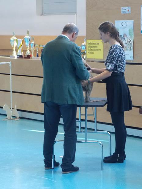 Am 27.09.2015 nahmen Gwenny und ich, Emma an der KFT-Ausstellung in Merchweiler teil. Der Richter Pedro Luis Sanches Delerue bewertete Gwenny mit einem V2 Reserve CAC und mich, Emma mit einem V3.